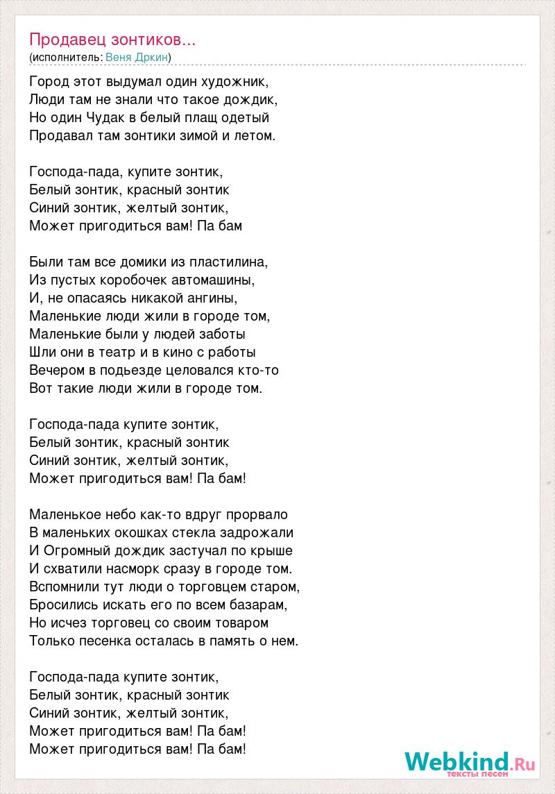 Город этот выдумал один художник, Люди там не знали что такое дождик, Но один Чудак в белый плащ одетый Продавал там зонтики зимой и летом. Господа-пада, купите зонтик, Белый зонтик, красный зонтик Синий зонтик, желтый зонтик, Может пригодиться вам! Па бам Были там все домики из пластилина, Из пустых коробочек автомашины, И, не опасаясь никакой ангины, Маленькие люди жили в городе том, Маленькие были у людей заботы Шли они в театр и в кино с работы Вечером в подьезде целовался кто-то Вот такие люди жили в городе том. Господа-пада купите зонтик, Белый зонтик, красный зонтик Синий зонтик, желтый зонтик, Может пригодиться вам! Па бам! Маленькое небо как-то вдруг прорвало В маленьких окошках стекла задрожали И Огромный дождик застучал по крыше И схватили насморк сразу в городе том. Вспомнили тут люди о торговцем старом, Бросились искать его по всем базарам, Но исчез торговец со своим товаром Только песенка осталась в память о нем. Господа-пада купите зонтик, Белый зонтик, красный зонтик Синий зонтик, желтый зонтик, Может пригодиться вам! Па бам! Может пригодиться вам! Па бам!