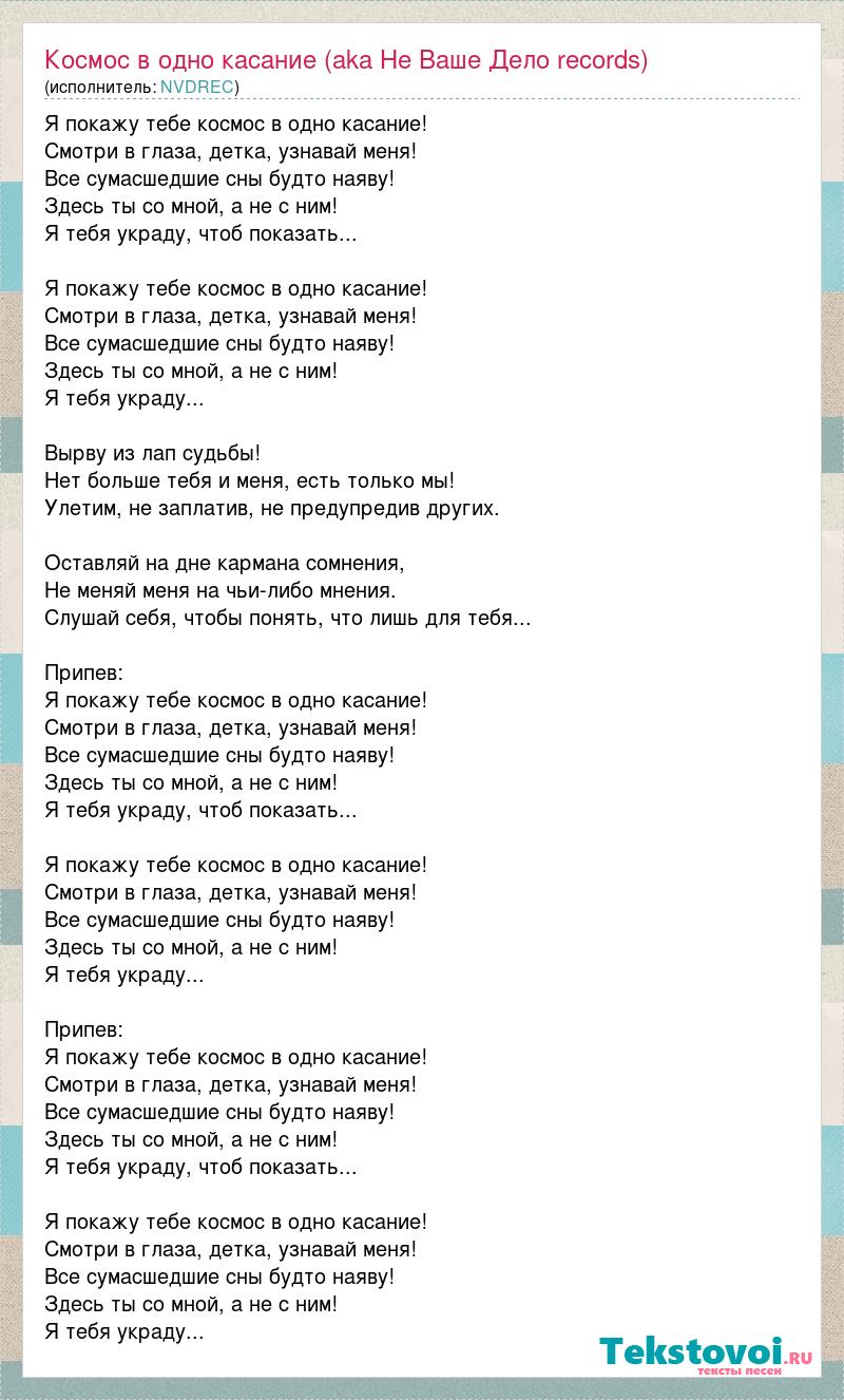 Я покажу тебе космос в одно касание! Смотри в глаза, детка, узнавай меня! Все сумасшедшие сны будто наяву! Здесь ты со мной, а не с ним! Я тебя украду, чтоб показать... Я покажу тебе космос в одно касание! Смотри в глаза, детка, узнавай меня! Все сумасшедшие сны будто наяву! Здесь ты со мной, а не с ним! Я тебя украду... Вырву из лап судьбы! Нет больше тебя и меня, есть только мы! Улетим, не заплатив, не предупредив других. Оставляй на дне кармана сомнения, Не меняй меня на чьи-либо мнения. Слушай себя, чтобы понять, что лишь для тебя... Припев: Я покажу тебе космос в одно касание! Смотри в глаза, детка, узнавай меня! Все сумасшедшие сны будто наяву! Здесь ты со мной, а не с ним! Я тебя украду, чтоб показать... Я покажу тебе космос в одно касание! Смотри в глаза, детка, узнавай меня! Все сумасшедшие сны будто наяву! Здесь ты со мной, а не с ним! Я тебя украду... Припев: Я покажу тебе космос в одно касание! Смотри в глаза, детка, узнавай меня! Все сумасшедшие сны будто наяву! Здесь ты со мной, а не с ним! Я тебя украду, чтоб показать... Я покажу тебе космос в одно касание! Смотри в глаза, детка, узнавай меня! Все сумасшедшие сны будто наяву! Здесь ты со мной, а не с ним! Я тебя украду...