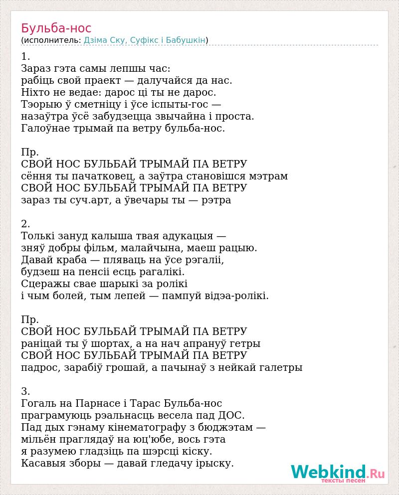 1. Зараз гэта самы лепшы час: рабіць свой праект — далучайся да нас. Ніхто не ведае: дарос ці ты не дарос. Тэорыю ў сметніцу і ўсе іспыты-гос — назаўтра ўсё забудзецца звычайна і проста. Галоўнае трымай па ветру бульба-нос. Пр. СВОЙ НОС БУЛЬБАЙ ТРЫМАЙ ПА ВЕТРУ сёння ты пачатковец, а заўтра становішся мэтрам СВОЙ НОС БУЛЬБАЙ ТРЫМАЙ ПА ВЕТРУ зараз ты суч.арт, а ўвечары ты — рэтра 2. Толькі зануд калыша твая адукацыя — зняў добры фільм, малайчына, маеш рацыю. Давай краба — пляваць на ўсе рэгаліі, будзеш на пенсіі есць рагалікі. Сцеражы свае шарыкі за ролікі і чым болей, тым лепей — пампуй відэа-ролікі. Пр. СВОЙ НОС БУЛЬБАЙ ТРЫМАЙ ПА ВЕТРУ раніцай ты ў шортах, а на нач апрануў гетры СВОЙ НОС БУЛЬБАЙ ТРЫМАЙ ПА ВЕТРУ падрос, зарабіў грошай, а пачынаў з нейкай галетры 3. Гогаль на Парнасе і Тарас Бульба-нос праграмуюць рэальнасць весела пад ДОС. Пад дых гэнаму кінематографу з бюджэтам — мільён праглядаў на юц'юбе, вось гэта я разумею гладзіць па шэрсці кіску. Касавыя зборы — давай гледачу ірыску.