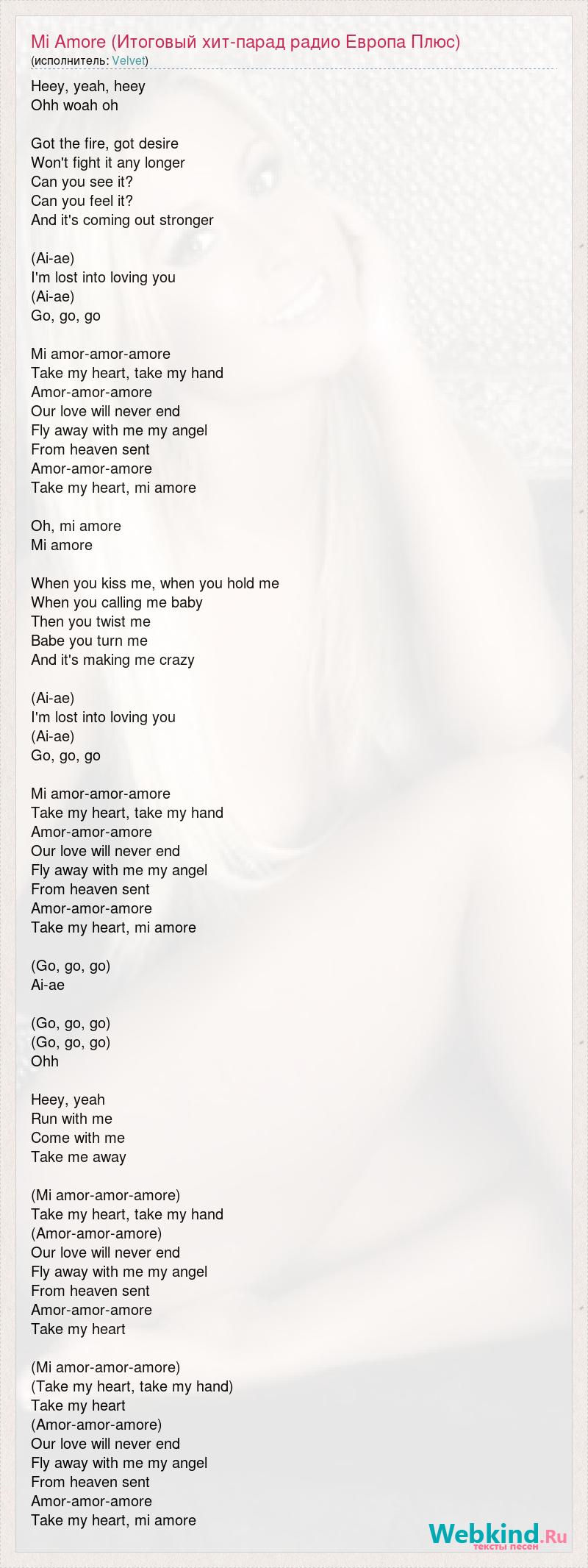 Heey, yeah, heey Ohh woah oh Got the fire, got desire Won't fight it any longer Can you see it? Can you feel it? And it's coming out stronger (Ai-ae) I'm lost into loving you (Ai-ae) Go, go, go Mi amor-amor-amore Take my heart, take my hand Amor-amor-amore Our love will never end Fly away with me my angel From heaven sent Amor-amor-amore Take my heart, mi amore Oh, mi amore Mi amore When you kiss me, when you hold me When you calling me baby Then you twist me Babe you turn me And it's making me crazy (Ai-ae) I'm lost into loving you (Ai-ae) Go, go, go Mi amor-amor-amore Take my heart, take my hand Amor-amor-amore Our love will never end Fly away with me my angel From heaven sent Amor-amor-amore Take my heart, mi amore (Go, go, go) Ai-ae (Go, go, go) (Go, go, go) Ohh Heey, yeah Run with me Come with me Take me away (Mi amor-amor-amore) Take my heart, take my hand (Amor-amor-amore) Our love will never end Fly away with me my angel From heaven sent Amor-amor-amore Take my heart (Mi amor-amor-amore) (Take my heart, take my hand) Take my heart (Amor-amor-amore) Our love will never end Fly away with me my angel From heaven sent Amor-amor-amore Take my heart, mi amore
