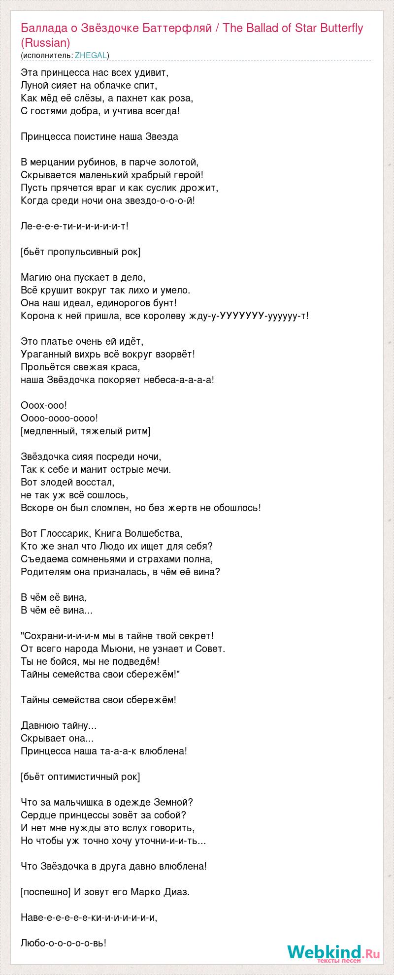 Эта принцесса нас всех удивит, Луной сияет на облачке спит, Как мёд её слёзы, а пахнет как роза, С гостями добра, и учтива всегда! Принцесса поистине наша Звезда В мерцании рубинов, в парче золотой, Скрывается маленький храбрый герой! Пусть прячется враг и как суслик дрожит, Когда среди ночи она звездо-о-о-о-й! Ле-е-е-е-ти-и-и-и-и-и-т! [бьёт пропульсивный рок] Магию она пускает в дело, Всё крушит вокруг так лихо и умело. Она наш идеал, единорогов бунт! Корона к ней пришла, все королеву жду-у-УУУУУУУ-уууууу-т! Это платье очень ей идёт, Ураганный вихрь всё вокруг взорвёт! Прольётся свежая краса, наша Звёздочка покоряет небеса-а-а-а-а! Ооох-ооо! Оооо-оооо-оооо! [медленный, тяжелый ритм] Звёздочка сияя посреди ночи, Так к себе и манит острые мечи. Вот злодей восстал, не так уж всё сошлось, Вскоре он был сломлен, но без жертв не обошлось! Вот Глоссарик, Книга Волшебства, Кто же знал что Людо их ищет для себя? Съедаема сомненьями и страхами полна, Родителям она призналась, в чём её вина? В чём её вина, В чём её вина... "Сохрани-и-и-и-м мы в тайне твой секрет! От всего народа Мьюни, не узнает и Совет. Ты не бойся, мы не подведём! Тайны семейства свои сбережём!" Тайны семейства свои сбережём! Давнюю тайну... Скрывает она... Принцесса наша та-а-а-к влюблена! [бьёт оптимистичный рок] Что за мальчишка в одежде Земной? Сердце принцессы зовёт за собой? И нет мне нужды это вслух говорить, Но чтобы уж точно хочу уточни-и-и-ть... Что Звёздочка в друга давно влюблена! [поспешно] И зовут его Марко Диаз. Наве-е-е-е-е-е-ки-и-и-и-и-и-и, Любо-о-о-о-о-о-вь!