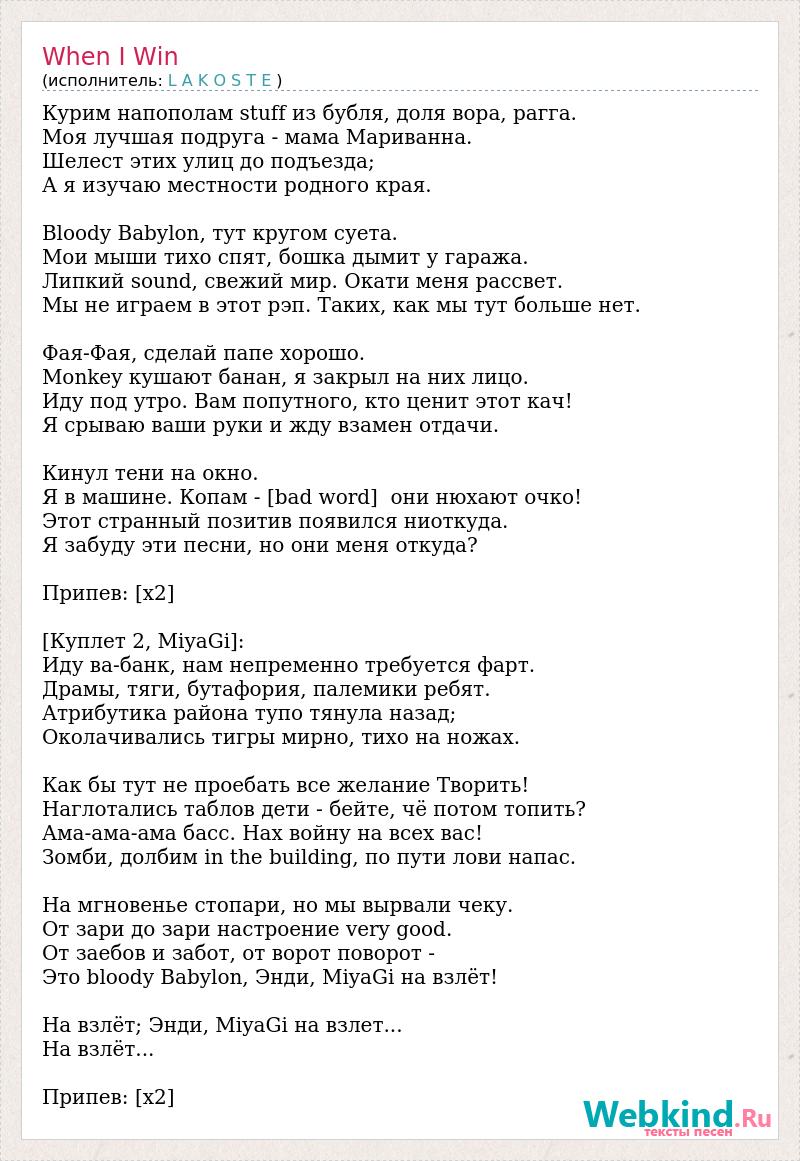 Курим напополам stuff из бубля, доля вора, рагга. Моя лучшая подруга - мама Мариванна. Шелест этих улиц до подъезда; А я изучаю местности родного края. Bloody Babylon, тут кругом суета. Мои мыши тихо спят, бошка дымит у гаража. Липкий sound, свежий мир. Окати меня рассвет. Мы не играем в этот рэп. Таких, как мы тут больше нет. Фая-Фая, сделай папе хорошо. Monkey кушают банан, я закрыл на них лицо. Иду под утро. Вам попутного, кто ценит этот кач! Я срываю ваши руки и жду взамен отдачи. Кинул тени на окно. Я в машине. Копам - [bad word] они нюхают очко! Этот странный позитив появился ниоткуда. Я забуду эти песни, но они меня откуда? Припев: [x2] [Куплет 2, MiyaGi]: Иду ва-банк, нам непременно требуется фарт. Драмы, тяги, бутафория, палемики ребят. Атрибутика района тупо тянула назад; Околачивались тигры мирно, тихо на ножах. Как бы тут не проебать все желание Творить! Наглотались таблов дети - бейте, чё потом топить? Ама-ама-ама басс. Нах войну на всех вас! Зомби, долбим in the building, по пути лови напас. На мгновенье стопари, но мы вырвали чеку. От зари до зари настроение very good. От заебов и забот, от ворот поворот - Это bloody Babylon, Энди, MiyaGi на взлёт! На взлёт; Энди, MiyaGi на взлет... На взлёт... Припев: [x2]