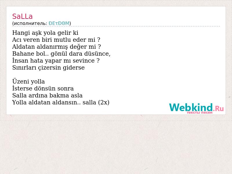 Hangi aşk yola gelir ki Acı veren biri mutlu eder mi ? Aldatan aldanırmış değer mi ? Bahane bol.. gönül dara düsünce, İnsan hata yapar mı sevince ? Sınırları çizersin giderse Üzeni yolla İsterse dönsün sonra Salla ardına bakma asla Yolla aldatan aldansın.. salla (2x)