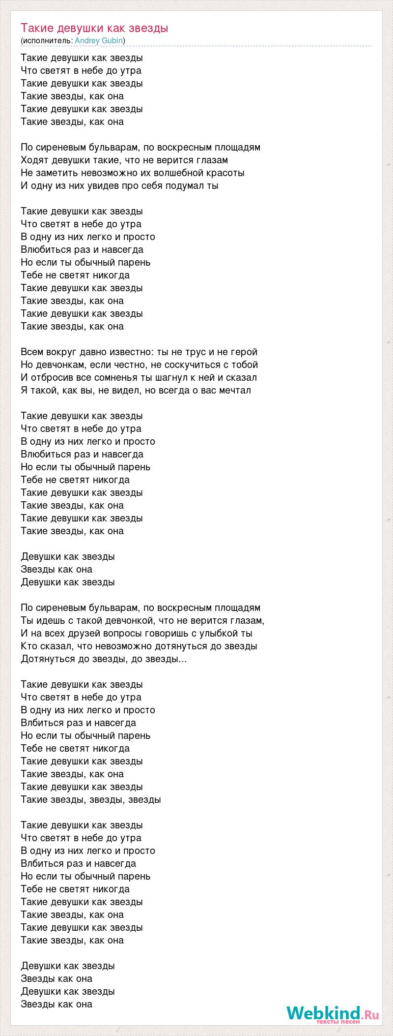 Такие девушки как звезды Что светят в небе до утра Такие девушки как звезды Такие звезды, как она Такие девушки как звезды Такие звезды, как она По сиреневым бульварам, по воскресным площадям Ходят девушки такие, что не верится глазам Не заметить невозможно их волшебной красоты И одну из них увидев про себя подумал ты Такие девушки как звезды Что светят в небе до утра В одну из них легко и просто Влюбиться раз и навсегда Но если ты обычный парень Тебе не светят никогда Такие девушки как звезды Такие звезды, как она Такие девушки как звезды Такие звезды, как она Всем вокруг давно известно: ты не трус и не герой Но девчонкам, если честно, не соскучиться с тобой И отбросив все сомненья ты шагнул к ней и сказал Я такой, как вы, не видел, но всегда о вас мечтал Такие девушки как звезды Что светят в небе до утра В одну из них легко и просто Влюбиться раз и навсегда Но если ты обычный парень Тебе не светят никогда Такие девушки как звезды Такие звезды, как она Такие девушки как звезды Такие звезды, как она Девушки как звезды Звезды как она Девушки как звезды По сиреневым бульварам, по воскресным площадям Ты идешь с такой девчонкой, что не верится глазам, И на всех друзей вопросы говоришь с улыбкой ты Кто сказал, что невозможно дотянуться до звезды Дотянуться до звезды, до звезды... Такие девушки как звезды Что светят в небе до утра В одну из них легко и просто Влбиться раз и навсегда Но если ты обычный парень Тебе не светят никогда Такие девушки как звезды Такие звезды, как она Такие девушки как звезды Такие звезды, звезды, звезды Такие девушки как звезды Что светят в небе до утра В одну из них легко и просто Влбиться раз и навсегда Но если ты обычный парень Тебе не светят никогда Такие девушки как звезды Такие звезды, как она Такие девушки как звезды Такие звезды, как она Девушки как звезды Звезды как она Девушки как звезды Звезды как она