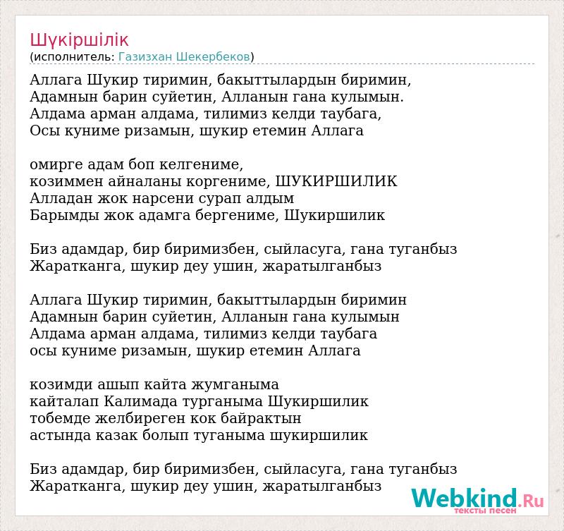 Аллага Шукир тиримин, бакыттылардын биримин, Адамнын барин суйетин, Алланын гана кулымын. Алдама арман алдама, тилимиз келди таубага, Осы куниме ризамын, шукир етемин Аллага омирге адам боп келгениме, козиммен айналаны коргениме, ШУКИРШИЛИК Алладан жок нарсени сурап алдым Барымды жок адамга бергениме, Шукиршилик Биз адамдар, бир биримизбен, сыйласуга, гана туганбыз Жаратканга, шукир деу ушин, жаратылганбыз Аллага Шукир тиримин, бакыттылардын биримин Адамнын барин суйетин, Алланын гана кулымын Алдама арман алдама, тилимиз келди таубага осы куниме ризамын, шукир етемин Аллага козимди ашып кайта жумганыма кайталап Калимада турганыма Шукиршилик тобемде желбиреген кок байрактын астында казак болып туганыма шукиршилик Биз адамдар, бир биримизбен, сыйласуга, гана туганбыз Жаратканга, шукир деу ушин, жаратылганбыз