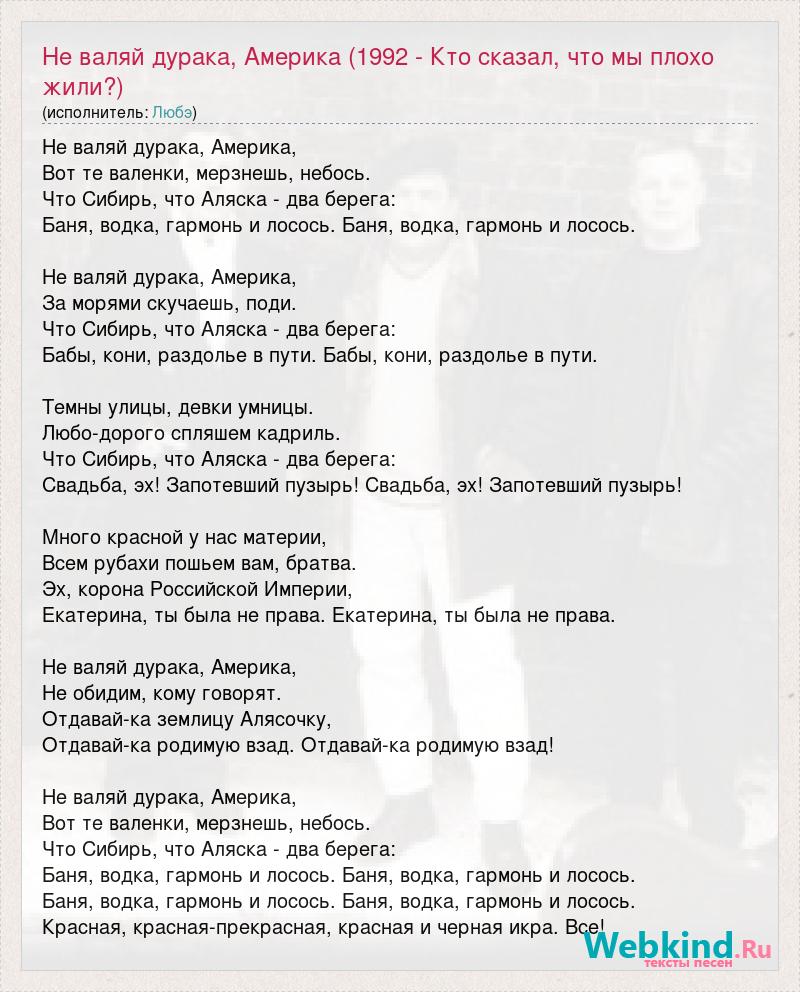Не валяй дурака, Америка, Вот те валенки, мерзнешь, небось. Что Сибирь, что Аляска - два берега: Баня, водка, гармонь и лосось. Баня, водка, гармонь и лосось. Не валяй дурака, Америка, За морями скучаешь, поди. Что Сибирь, что Аляска - два берега: Бабы, кони, раздолье в пути. Бабы, кони, раздолье в пути. Темны улицы, девки умницы. Любо-дорого спляшем кадриль. Что Сибирь, что Аляска - два берега: Свадьба, эх! Запотевший пузырь! Свадьба, эх! Запотевший пузырь! Много красной у нас материи, Всем рубахи пошьем вам, братва. Эх, корона Российской Империи, Екатерина, ты была не права. Екатерина, ты была не права. Не валяй дурака, Америка, Не обидим, кому говорят. Отдавай-ка землицу Алясочку, Отдавай-ка родимую взад. Отдавай-ка родимую взад! Не валяй дурака, Америка, Вот те валенки, мерзнешь, небось. Что Сибирь, что Аляска - два берега: Баня, водка, гармонь и лосось. Баня, водка, гармонь и лосось. Баня, водка, гармонь и лосось. Баня, водка, гармонь и лосось. Красная, красная-прекрасная, красная и черная икра. Все!
