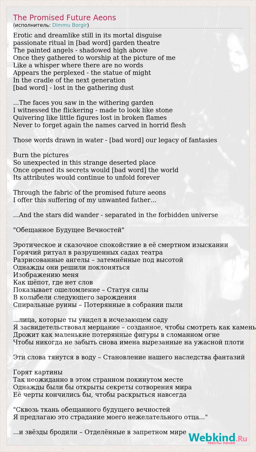 Erotic and dreamlike still in its mortal disguise passionate ritual in [bad word] garden theatre The painted angels - shadowed high above Once they gathered to worship at the picture of me Like a whisper where there are no words Appears the perplexed - the statue of might In the cradle of the next generation [bad word] - lost in the gathering dust ...The faces you saw in the withering garden I witnessed the flickering - made to look like stone Quivering like little figures lost in broken flames Never to forget again the names carved in horrid flesh Those words drawn in water - [bad word] our legacy of fantasies Burn the pictures So unexpected in this strange deserted place Once opened its secrets would [bad word] the world Its attributes would continue to unfold forever Through the fabric of the promised future aeons I offer this suffering of my unwanted father... ...And the stars did wander - separated in the forbidden universe "Обещанное Будущее Вечностей" Эротическое и сказочное спокойствие в её смертном изыскании Горячий ритуал в разрушенных садах театра Разрисованные ангелы – затемнённые под высотой Однажды они решили поклоняться Изображению меня Как шёпот, где нет слов Показывает ошеломление – Статуя силы В колыбели следующего зарождения Спиральные руины – Потерянные в собрании пыли ...лица, которые ты увидел в исчезающем саду Я засвидетельствовал мерцание – созданное, чтобы смотреть как камень Дрожит как маленькие потерянные фигуры в сломанном огне Чтобы никогда не забыть снова имена вырезанные на ужасной плоти Эти слова тянутся в воду – Становление нашего наследства фантазий Горят картины Так неожиданно в этом странном покинутом месте Однажды были бы открыты секреты сотворения мира Её черты кончились бы, чтобы раскрыться навсегда "Сквозь ткань обещанного будущего вечностей Я предлагаю это страдание моего нежелательного отца..." ...и звёзды бродили – Отделённые в запретном мире