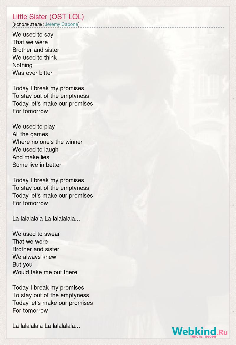 We used to say That we were Brother and sister We used to think Nothing Was ever bitter Today I break my promises To stay out of the emptyness Today let's make our promises For tomorrow We used to play All the games Where no one's the winner We used to laugh And make lies Some live in better Today I break my promises To stay out of the emptyness Today let's make our promises For tomorrow La lalalalala La lalalalala... We used to swear That we were Brother and sister We always knew But you Would take me out there Today I break my promises To stay out of the emptyness Today let's make our promises For tomorrow La lalalalala La lalalalala...