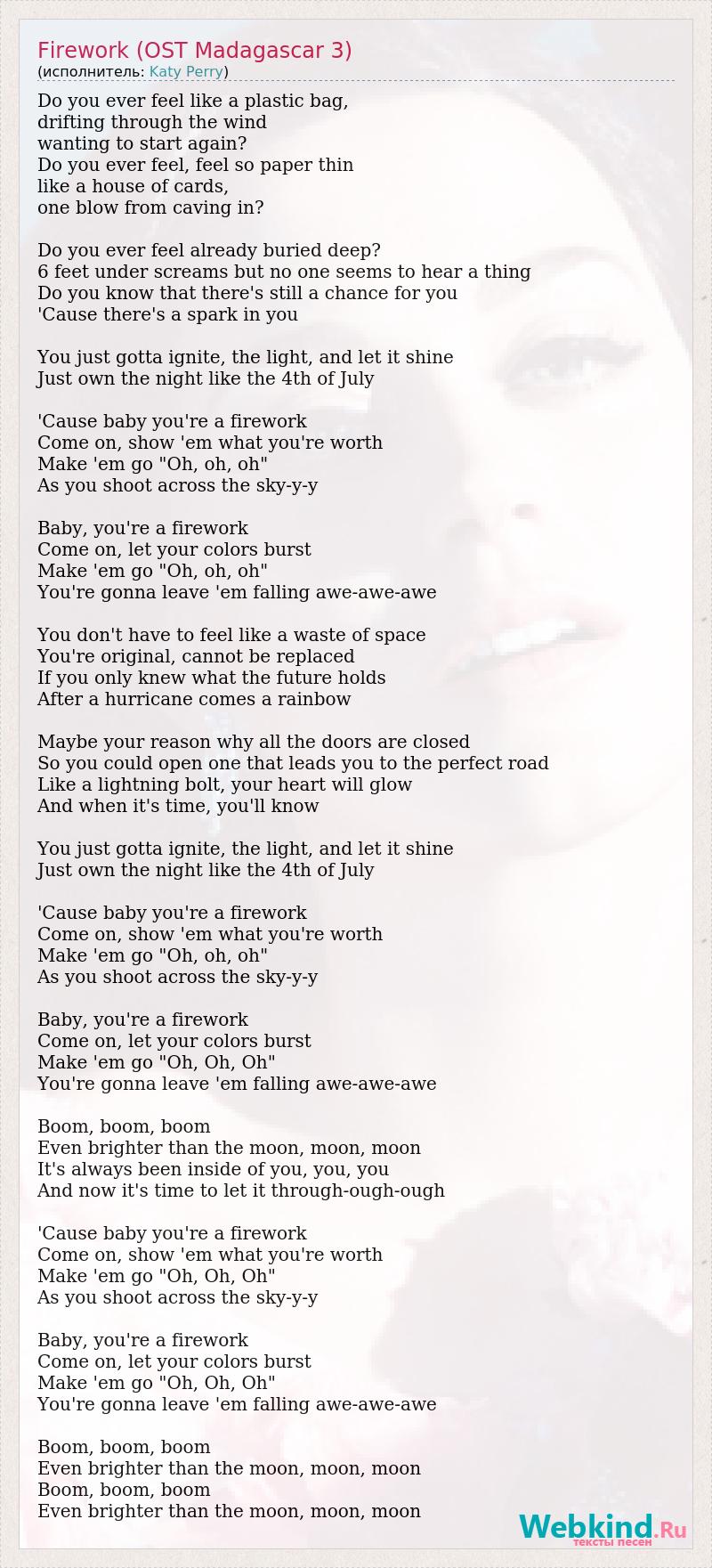 Do you ever feel like a plastic bag, drifting through the wind wanting to start again? Do you ever feel, feel so paper thin like a house of cards, one blow from caving in? Do you ever feel already buried deep? 6 feet under screams but no one seems to hear a thing Do you know that there's still a chance for you 'Cause there's a spark in you You just gotta ignite, the light, and let it shine Just own the night like the 4th of July 'Cause baby you're a firework Come on, show 'em what you're worth Make 'em go "Oh, oh, oh" As you shoot across the sky-y-y Baby, you're a firework Come on, let your colors burst Make 'em go "Oh, oh, oh" You're gonna leave 'em falling awe-awe-awe You don't have to feel like a waste of space You're original, cannot be replaced If you only knew what the future holds After a hurricane comes a rainbow Maybe your reason why all the doors are closed So you could open one that leads you to the perfect road Like a lightning bolt, your heart will glow And when it's time, you'll know You just gotta ignite, the light, and let it shine Just own the night like the 4th of July 'Cause baby you're a firework Come on, show 'em what you're worth Make 'em go "Oh, oh, oh" As you shoot across the sky-y-y Baby, you're a firework Come on, let your colors burst Make 'em go "Oh, Oh, Oh" You're gonna leave 'em falling awe-awe-awe Boom, boom, boom Even brighter than the moon, moon, moon It's always been inside of you, you, you And now it's time to let it through-ough-ough 'Cause baby you're a firework Come on, show 'em what you're worth Make 'em go "Oh, Oh, Oh" As you shoot across the sky-y-y Baby, you're a firework Come on, let your colors burst Make 'em go "Oh, Oh, Oh" You're gonna leave 'em falling awe-awe-awe Boom, boom, boom Even brighter than the moon, moon, moon Boom, boom, boom Even brighter than the moon, moon, moon