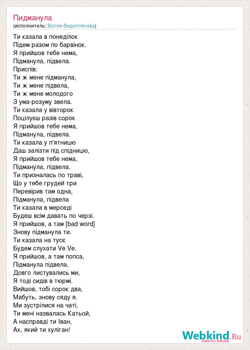 Ти казала в понеділок Підем разом по барвінок. Я прийшов тебе нема, Підманула, підвела. Приспів: Ти ж мене підманула, Ти ж мене підвела, Ти ж мене молодого З ума-розуму звела. Ти казала у вівторок Поцілуєш разів сорок Я прийшов тебе нема, Підманула, підвела. Ти казала у п'ятницю Даш залізти під спідницю, Я прийшов тебе нема, Підманула, підвела. Ти призналась по траві, Що у тебе грудей три Перевірив там одна, Підманула, підвела Ти казала в мерседі Будеш всім давать по черзі. Я прийшов, а там [bad word] Знову підманула ти. Ти казала на тусє Будем слухати Vе.Vе. Я прийшов, а там попса, Підманула підвела. Довго листувались ми, Я тоді сидів в тюрмі. Вийшов, тобі сорок два, Мабуть, знову сяду я. Ми зустрілися на чаті, Ти мені назвалась Катьой, А насправді ти Іван, Ах, який ти хуліган!