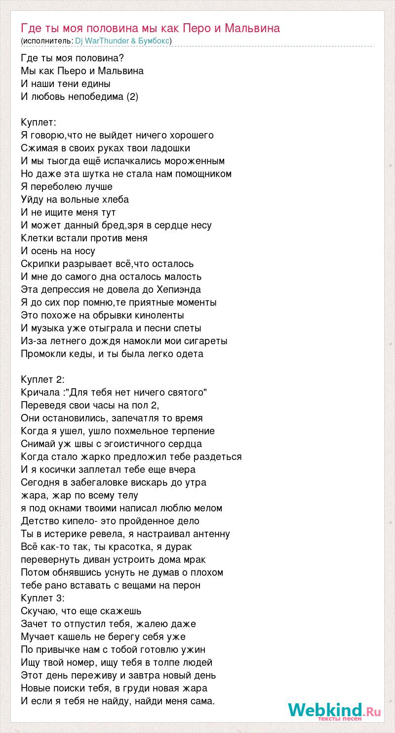 Где ты моя половина? Мы как Пьеро и Мальвина И наши тени едины И любовь непобедима (2) Куплет: Я говорю,что не выйдет ничего хорошего Сжимая в своих руках твои ладошки И мы тыогда ещё испачкались мороженным Но даже эта шутка не стала нам помощником Я переболею лучше Уйду на вольные хлеба И не ищите меня тут И может данный бред,зря в сердце несу Клетки встали против меня И осень на носу Скрипки разрывает всё,что осталось И мне до самого дна осталось малость Эта депрессия не довела до Хепиэнда Я до сих пор помню,те приятные моменты Это похоже на обрывки киноленты И музыка уже отыграла и песни спеты Из-за летнего дождя намокли мои сигареты Промокли кеды, и ты была легко одета Куплет 2: Кричала :"Для тебя нет ничего святого" Переведя свои часы на пол 2, Они остановились, запечатля то время Когда я ушел, ушло похмельное терпение Снимай уж швы с эгоистичного сердца Когда стало жарко предложил тебе раздеться И я косички заплетал тебе еще вчера Сегодня в забегаловке вискарь до утра жара, жар по всему телу я под окнами твоими написал люблю мелом Детство кипело- это пройденное дело Ты в истерике ревела, я настраивал антенну Всё как-то так, ты красотка, я дурак перевернуть диван устроить дома мрак Потом обнявшись уснуть не думав о плохом тебе рано вставать с вещами на перон Куплет 3: Скучаю, что еще скажешь Зачет то отпустил тебя, жалею даже Мучает кашель не берегу себя уже По привычке нам с тобой готовлю ужин Ищу твой номер, ищу тебя в толпе людей Этот день переживу и завтра новый день Новые поиски тебя, в груди новая жара И если я тебя не найду, найди меня сама.