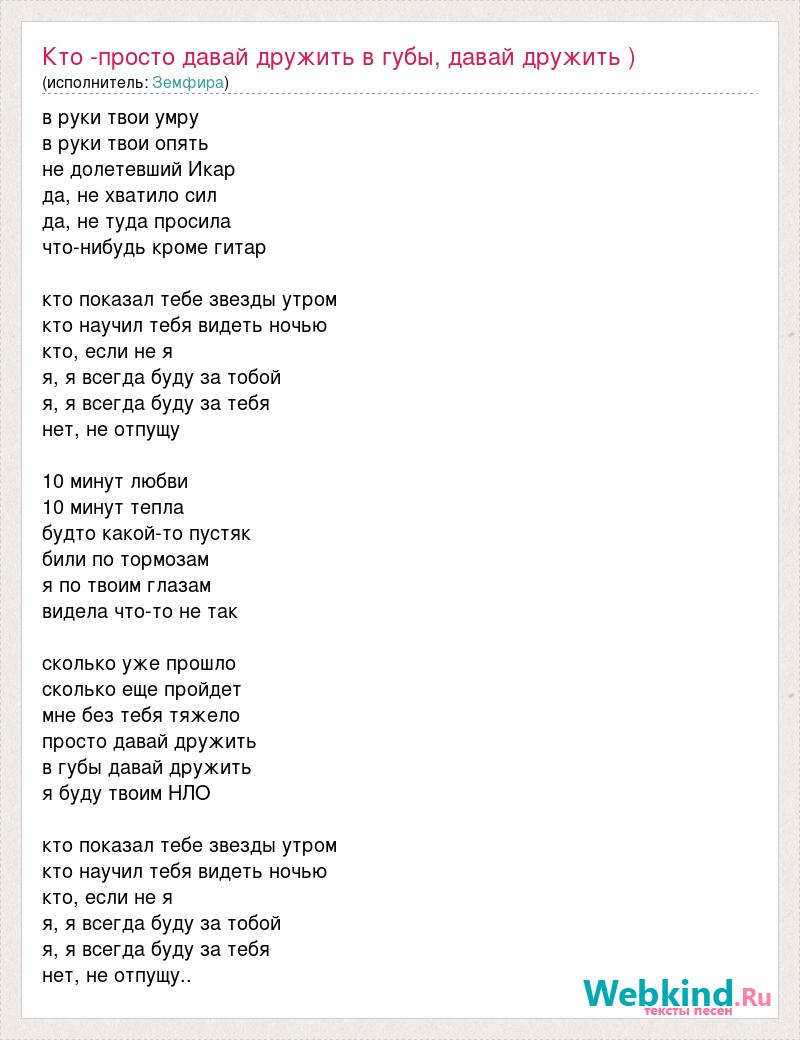 в руки твои умру в руки твои опять не долетевший Икар да, не хватило сил да, не туда просила что-нибудь кроме гитар кто показал тебе звезды утром кто научил тебя видеть ночью кто, если не я я, я всегда буду за тобой я, я всегда буду за тебя нет, не отпущу 10 минут любви 10 минут тепла будто какой-то пустяк били по тормозам я по твоим глазам видела что-то не так сколько уже прошло сколько еще пройдет мне без тебя тяжело просто давай дружить в губы давай дружить я буду твоим НЛО кто показал тебе звезды утром кто научил тебя видеть ночью кто, если не я я, я всегда буду за тобой я, я всегда буду за тебя нет, не отпущу..