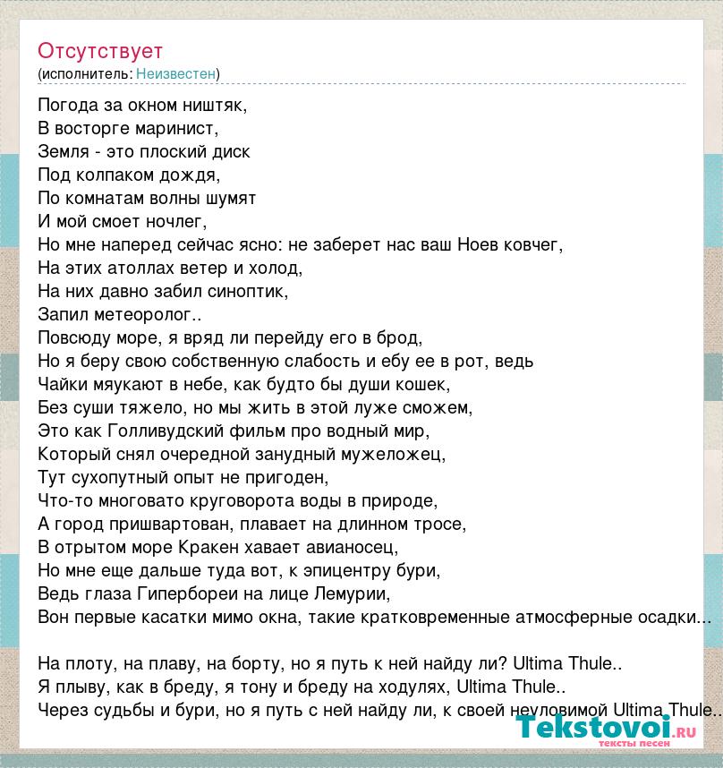 Погода за окном ништяк, В восторге маринист, Земля - это плоский диск Под колпаком дождя, По комнатам волны шумят И мой смоет ночлег, Но мне наперед сейчас ясно: не заберет нас ваш Ноев ковчег, На этих атоллах ветер и холод, На них давно забил синоптик, Запил метеоролог.. Повсюду море, я вряд ли перейду его в брод, Но я беру свою собственную слабость и ебу ее в рот, ведь Чайки мяукают в небе, как будто бы души кошек, Без суши тяжело, но мы жить в этой луже сможем, Это как Голливудский фильм про водный мир, Который снял очередной занудный мужеложец, Тут сухопутный опыт не пригоден, Что-то многовато круговорота воды в природе, А город пришвартован, плавает на длинном тросе, В отрытом море Кракен хавает авианосец, Но мне еще дальше туда вот, к эпицентру бури, Ведь глаза Гипербореи на лице Лемурии, Вон первые касатки мимо окна, такие кратковременные атмосферные осадки... На плоту, на плаву, на борту, но я путь к ней найду ли? Ultima Thule.. Я плыву, как в бреду, я тону и бреду на ходулях, Ultima Thule.. Через судьбы и бури, но я путь с ней найду ли, к своей неуловимой Ultima Thule..