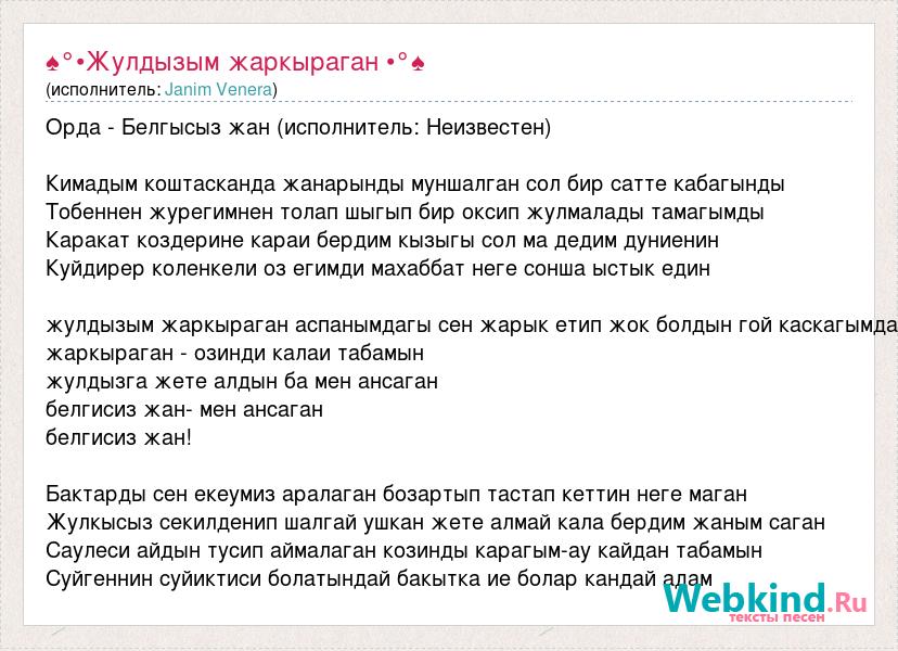 Орда - Белгысыз жан (исполнитель: Неизвестен) Кимадым коштасканда жанарынды муншалган сол бир сатте кабагынды Тобеннен журегимнен толап шыгып бир оксип жулмалады тамагымды Каракат коздерине караи бердим кызыгы сол ма дедим дуниенин Куйдирер коленкели оз егимди махаббат неге сонша ыстык един жулдызым жаркыраган аспанымдагы сен жарык етип жок болдын гой каскагымда жаркыраган - озинди калаи табамын жулдызга жете алдын ба мен ансаган белгисиз жан- мен ансаган белгисиз жан! Бактарды сен екеумиз аралаган бозартып тастап кеттин неге маган Жулкысыз секилденип шалгай ушкан жете алмай кала бердим жаным саган Саулеси айдын тусип аймалаган козинды карагым-ау кайдан табамын Суйгеннин суйиктиси болатындай бакытка ие болар кандай адам