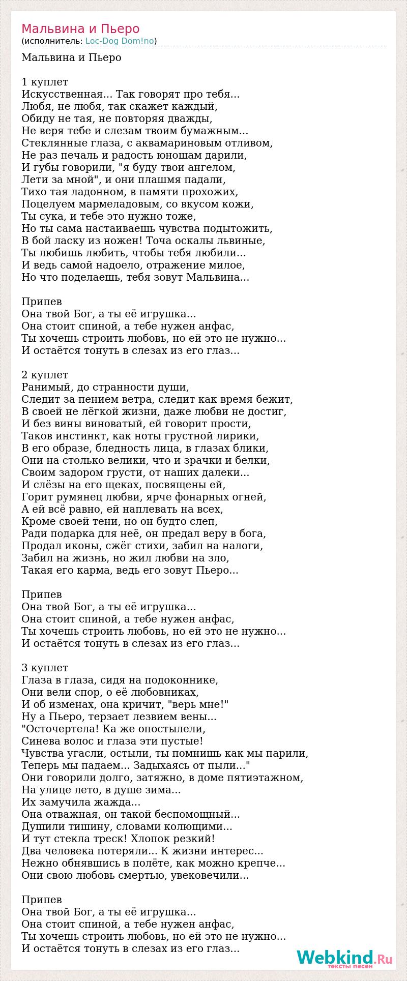 Мальвина и Пьеро 1 куплет Искусственная... Так говорят про тебя... Любя, не любя, так скажет каждый, Обиду не тая, не повторяя дважды, Не веря тебе и слезам твоим бумажным... Стеклянные глаза, с аквамариновым отливом, Не раз печаль и радость юношам дарили, И губы говорили, "я буду твои ангелом, Лети за мной", и они плашмя падали, Тихо тая ладонном, в памяти прохожих, Поцелуем мармеладовым, со вкусом кожи, Ты сука, и тебе это нужно тоже, Но ты сама настаиваешь чувства подытожить, В бой ласку из ножен! Точа оскалы львиные, Ты любишь любить, чтобы тебя любили... И ведь самой надоело, отражение милое, Но что поделаешь, тебя зовут Мальвина... Припев Она твой Бог, а ты её игрушка... Она стоит спиной, а тебе нужен анфас, Ты хочешь строить любовь, но ей это не нужно... И остаётся тонуть в слезах из его глаз... 2 куплет Ранимый, до странности души, Следит за пением ветра, следит как время бежит, В своей не лёгкой жизни, даже любви не достиг, И без вины виноватый, ей говорит прости, Таков инстинкт, как ноты грустной лирики, В его образе, бледность лица, в глазах блики, Они на столько велики, что и зрачки и белки, Своим задором грусти, от наших далеки... И слёзы на его щеках, посвящены ей, Горит румянец любви, ярче фонарных огней, А ей всё равно, ей наплевать на всех, Кроме своей тени, но он будто слеп, Ради подарка для неё, он предал веру в бога, Продал иконы, сжёг стихи, забил на налоги, Забил на жизнь, но жил любви на зло, Такая его карма, ведь его зовут Пьеро... Припев Она твой Бог, а ты её игрушка... Она стоит спиной, а тебе нужен анфас, Ты хочешь строить любовь, но ей это не нужно... И остаётся тонуть в слезах из его глаз... 3 куплет Глаза в глаза, сидя на подоконнике, Они вели спор, о её любовниках, И об изменах, она кричит, "верь мне!" Ну а Пьеро, терзает лезвием вены... "Осточертела! Ка же опостылели, Синева волос и глаза эти пустые! Чувства угасли, остыли, ты помнишь как мы парили, Теперь мы падаем... Задыхаясь от пыли..." Они говорили долго, затяжно, в доме пятиэтажном, На улице лето, в душе зима... Их замучила жажда... Она отважная, он такой беспомощный... Душили тишину, словами колющими... И тут стекла треск! Хлопок резкий! Два человека потеряли... К жизни интерес... Нежно обнявшись в полёте, как можно крепче... Они свою любовь смертью, увековечили... Припев Она твой Бог, а ты её игрушка... Она стоит спиной, а тебе нужен анфас, Ты хочешь строить любовь, но ей это не нужно... И остаётся тонуть в слезах из его глаз...