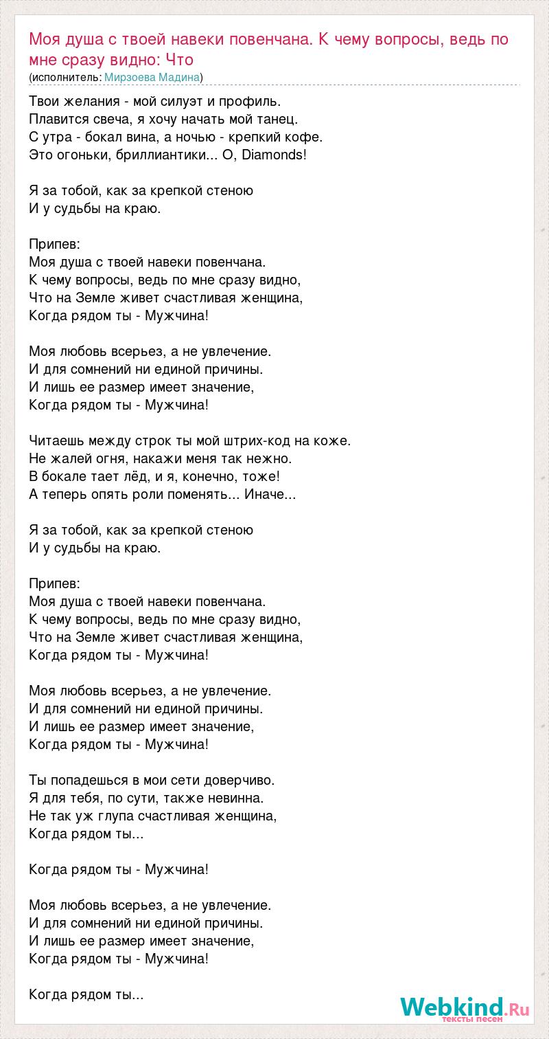 Главная→Исполнители→Мирзоева Мадина→Моя душа с твоей навеки повенчана. К чему вопросы, ведь по мне сразу видно