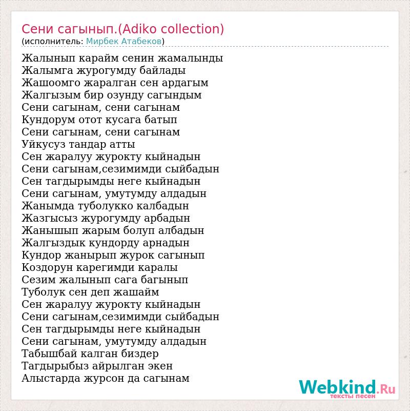 Жалынып карайм сенин жамалынды Жалымга журогумду байлады Жашоомго жаралган сен ардагым Жалгызым бир озунду сагындым Сени сагынам, сени сагынам Кундорум отот кусага батып Сени сагынам, сени сагынам Уйкусуз тандар атты Сен жаралуу журокту кыйнадын Сени сагынам,сезимимди сыйбадын Сен тагдырымды неге кыйнадын Сени сагынам, умутумду алдадын Жанымда туболукко калбадын Жазгысыз журогумду арбадын Жанышып жарым болуп албадын Жалгыздык кундорду арнадын Кундор жанырып журок сагынып Коздорун карегимди каралы Сезим жалынып сага багынып Туболук сен деп жашайм Сен жаралуу журокту кыйнадын Сени сагынам,сезимимди сыйбадын Сен тагдырымды неге кыйнадын Сени сагынам, умутумду алдадын Табышбай калган биздер Тагдырыбыз айрылган экен Алыстарда журсон да сагынам