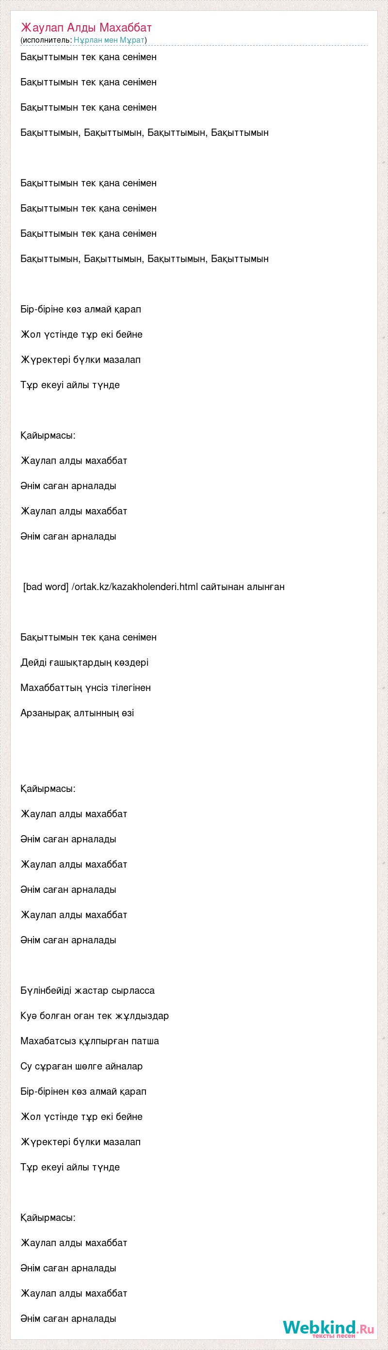 Бақыттымын тек қана сенімен Бақыттымын тек қана сенімен Бақыттымын тек қана сенімен Бақыттымын, Бақыттымын, Бақыттымын, Бақыттымын Бақыттымын тек қана сенімен Бақыттымын тек қана сенімен Бақыттымын тек қана сенімен Бақыттымын, Бақыттымын, Бақыттымын, Бақыттымын Бір-біріне көз алмай қарап Жол үстінде тұр екі бейне Жүректері бүлки мазалап Тұр екеуі айлы түнде Қайырмасы: Жаулап алды махаббат Әнім саған арналады Жаулап алды махаббат Әнім саған арналады [bad word] /ortak.kz/kazakholenderi.html сайтынан алынған Бақыттымын тек қана сенімен Дейді ғашықтардың көздері Махаббаттың үнсіз тілегінен Арзанырақ алтынның өзі Қайырмасы: Жаулап алды махаббат Әнім саған арналады Жаулап алды махаббат Әнім саған арналады Жаулап алды махаббат Әнім саған арналады Бүлінбейіді жастар сырласса Куә болған оған тек жұлдыздар Махабатсыз құлпырған патша Су сұраған шөлге айналар Бір-бірінен көз алмай қарап Жол үстінде тұр екі бейне Жүректері бүлки мазалап Тұр екеуі айлы түнде Қайырмасы: Жаулап алды махаббат Әнім саған арналады Жаулап алды махаббат Әнім саған арналады
