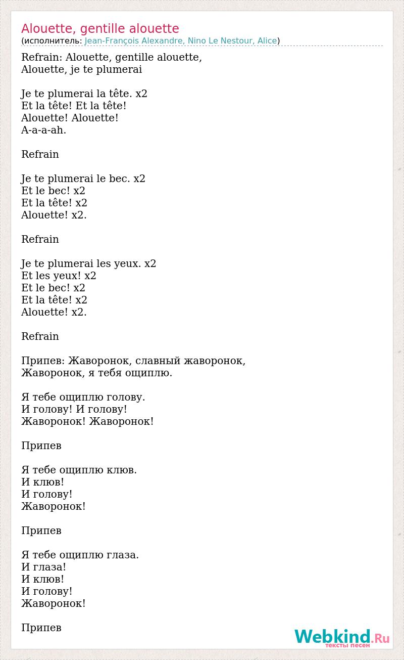 Refrain: Alouette, gentille alouette, Alouette, je te plumerai Je te plumerai la tête. x2 Et la tête! Et la tête! Alouette! Alouette! A-a-a-ah. Refrain Je te plumerai le bec. x2 Et le bec! x2 Et la tête! x2 Alouette! x2. Refrain Je te plumerai les yeux. x2 Et les yeux! x2 Et le bec! x2 Et la tête! x2 Alouette! x2. Refrain Припев: Жаворонок, славный жаворонок, Жаворонок, я тебя ощиплю. Я тебе ощиплю голову. И голову! И голову! Жаворонок! Жаворонок! Припев Я тебе ощиплю клюв. И клюв! И голову! Жаворонок! Припев Я тебе ощиплю глаза. И глаза! И клюв! И голову! Жаворонок! Припев