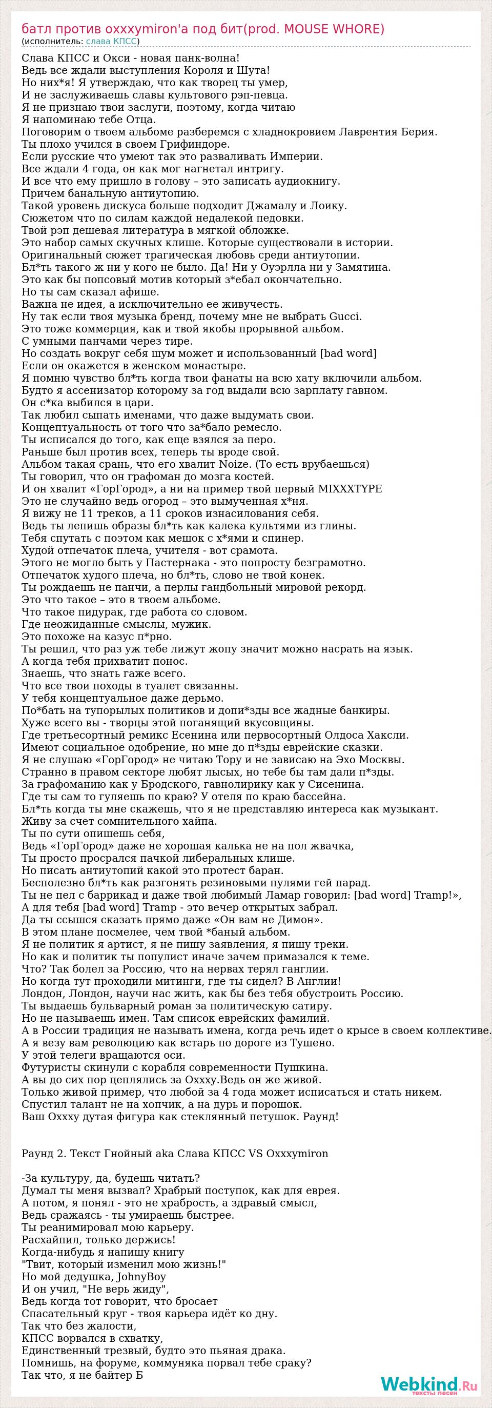 Слава КПСС и Окси - новая панк-волна! Ведь все ждали выступления Короля и Шута! Но них*я! Я утверждаю, что как творец ты умер, И не заслуживаешь славы культового рэп-певца. Я не признаю твои заслуги, поэтому, когда читаю Я напоминаю тебе Отца. Поговорим о твоем альбоме разберемся с хладнокровием Лаврентия Берия. Ты плохо учился в своем Грифиндоре. Если русские что умеют так это разваливать Империи. Все ждали 4 года, он как мог нагнетал интригу. И все что ему пришло в голову – это записать аудиокнигу. Причем банальную антиутопию. Такой уровень дискуса больше подходит Джамалу и Лоику. Сюжетом что по силам каждой недалекой педовки. Твой рэп дешевая литература в мягкой обложке. Это набор самых скучных клише. Которые существовали в истории. Оригинальный сюжет трагическая любовь среди антиутопии. Бл*ть такого ж ни у кого не было. Да! Ни у Оуэрлла ни у Замятина. Это как бы попсовый мотив который з*ебал окончательно. Но ты сам сказал афише. Важна не идея, а исключительно ее живучесть. Ну так если твоя музыка бренд, почему мне не выбрать Gucci. Это тоже коммерция, как и твой якобы прорывной альбом. С умными панчами через тире. Но создать вокруг себя шум может и использованный [bad word] Если он окажется в женском монастыре. Я помню чувство бл*ть когда твои фанаты на всю хату включили альбом. Будто я ассенизатор которому за год выдали всю зарплату гавном. Он с*ка выбился в цари. Так любил сыпать именами, что даже выдумать свои. Концептуальность от того что за*бало ремесло. Ты исписался до того, как еще взялся за перо. Раньше был против всех, теперь ты вроде свой. Альбом такая срань, что его хвалит Noize. (То есть врубаешься) Ты говорил, что он графоман до мозга костей. И он хвалит «ГорГород», а ни на пример твой первый MIXXXTYPE Это не случайно ведь огород – это вымученная х*ня. Я вижу не 11 треков, а 11 сроков изнасилования себя. Ведь ты лепишь образы бл*ть как калека культями из глины. Тебя спутать с поэтом как мешок с х*ями и спинер. Худой отпечаток плеча, учителя - вот срамота. Этого не могло быть у Пастернака - это попросту безграмотно. Отпечаток худого плеча, но бл*ть, слово не твой конек. Ты рождаешь не панчи, а перлы гандбольный мировой рекорд. Это что такое – это в твоем альбоме. Что такое пидурак, где работа со словом. Где неожиданные смыслы, мужик. Это похоже на казус п*рно. Ты решил, что раз уж тебе лижут жопу значит можно насрать на язык. А когда тебя прихватит понос. Знаешь, что знать гаже всего. Что все твои походы в туалет связанны. У тебя концептуальное даже дерьмо. По*бать на тупорылых политиков и допи*зды все жадные банкиры. Хуже всего вы - творцы этой поганящий вкусовщины. Где третьесортный ремикс Есенина или первосортный Олдоса Хаксли. Имеют социальное одобрение, но мне до п*зды еврейские сказки. Я не слушаю «ГорГород» не читаю Тору и не зависаю на Эхо Москвы. Странно в правом секторе любят лысых, но тебе бы там дали п*зды. За графоманию как у Бродского, гавнолирику как у Сисенина. Где ты сам то гуляешь по краю? У отеля по краю бассейна. Бл*ть когда ты мне скажешь, что я не представляю интереса как музыкант. Живу за счет сомнительного хайпа. Ты по сути опишешь себя, Ведь «ГорГород» даже не хорошая калька не на пол жвачка, Ты просто просрался пачкой либеральных клише. Но писать антиутопий какой это протест баран. Бесполезно бл*ть как разгонять резиновыми пулями гей парад. Ты не пел 