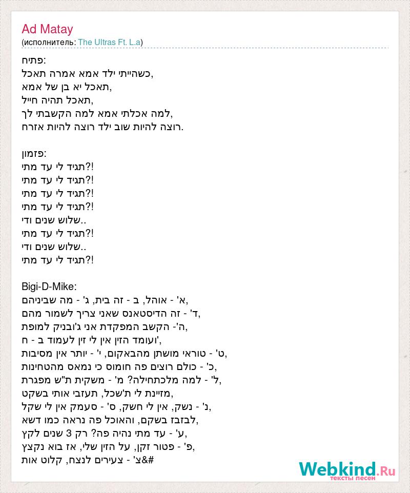 פתיח: כשהייתי ילד אמא אמרה תאכל, תאכל יא בן של אמא, תאכל תהיה חייל, למה אכלתי אמא למה הקשבתי לך, רוצה להיות שוב ילד רוצה להיות אזרח. פזמון: תגיד לי עד מתי?! תגיד לי עד מתי?! תגיד לי עד מתי?! תגיד לי עד מתי?! שלוש שנים ודי.. תגיד לי עד מתי?! שלוש שנים ודי.. תגיד לי עד מתי?! Bigi-D-Mike: א' - אוהל, ב - זה בית, ג' - מה שביניהם, ד' - זה הדיסטאנס שאני צריך לשמור מהם, ה'- הקשב המפקדת אני ג'ובניק למופת, ועומד הזין אין לי זין לעמוד ב - ח', ט' - טוראי מושתן מהבאקום, י' - יותר אין מסיבות, כ' - כולם רוצים פה חומוס כי נמאס מהטחינות, ל' - למה מלכתחילה? מ' - משקית ת"ש מפגרת, מזיינת לי ת'שכל, תעזבי אותי בשקט, נ' - נשק, אין לי חשק, ס' - סעמק אין לי שקל, לבזבז בשקם, והאוכל פה נראה כמו דשא, ע' - עד מתי נהיה פה? רק 3 שנים לקץ, פ' - פטור זקן, על הזין שלי, אז בוא נקצץ, צ' - צעירים לנצח, קלוט אות
