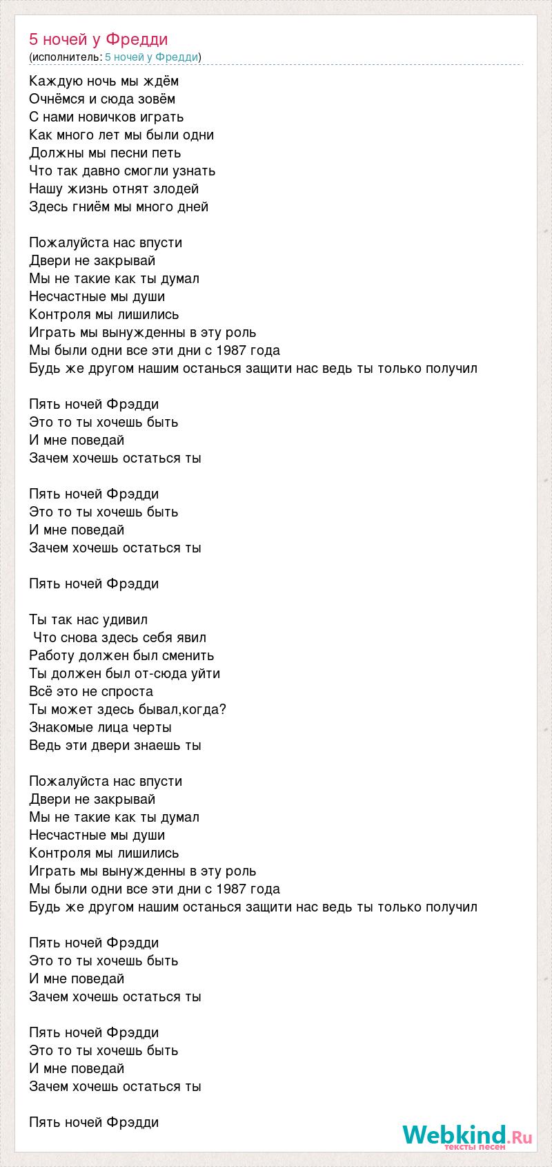 Каждую ночь мы ждём Очнёмся и сюда зовём С нами новичков играть Как много лет мы были одни Должны мы песни петь Что так давно смогли узнать Нашу жизнь отнят злодей Здесь гниём мы много дней Пожалуйста нас впусти Двери не закрывай Мы не такие как ты думал Несчастные мы души Контроля мы лишились Играть мы вынужденны в эту роль Мы были одни все эти дни с 1987 года Будь же другом нашим останься защити нас ведь ты только получил Пять ночей Фрэдди Это то ты хочешь быть И мне поведай Зачем хочешь остаться ты Пять ночей Фрэдди Это то ты хочешь быть И мне поведай Зачем хочешь остаться ты Пять ночей Фрэдди Ты так нас удивил Что снова здесь себя явил Работу должен был сменить Ты должен был от-сюда уйти Всё это не спроста Ты может здесь бывал,когда? Знакомые лица черты Ведь эти двери знаешь ты Пожалуйста нас впусти Двери не закрывай Мы не такие как ты думал Несчастные мы души Контроля мы лишились Играть мы вынужденны в эту роль Мы были одни все эти дни с 1987 года Будь же другом нашим останься защити нас ведь ты только получил Пять ночей Фрэдди Это то ты хочешь быть И мне поведай Зачем хочешь остаться ты Пять ночей Фрэдди Это то ты хочешь быть И мне поведай Зачем хочешь остаться ты Пять ночей Фрэдди