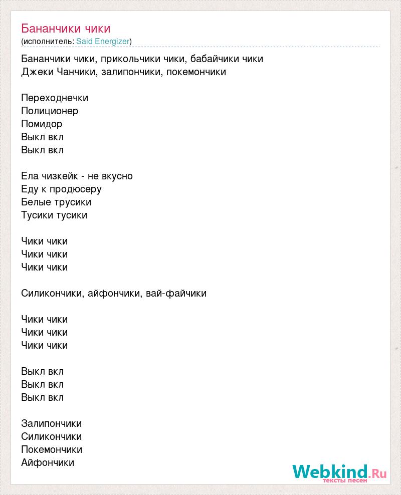 Бананчики чики, прикольчики чики, бабайчики чики Джеки Чанчики, залипончики, покемончики Переходнечки Полиционер Помидор Выкл вкл Выкл вкл Ела чизкейк - не вкусно Еду к продюсеру Белые трусики Тусики тусики Чики чики Чики чики Чики чики Силикончики, айфончики, вай-файчики Чики чики Чики чики Чики чики Выкл вкл Выкл вкл Выкл вкл Залипончики Силикончики Покемончики Айфончики