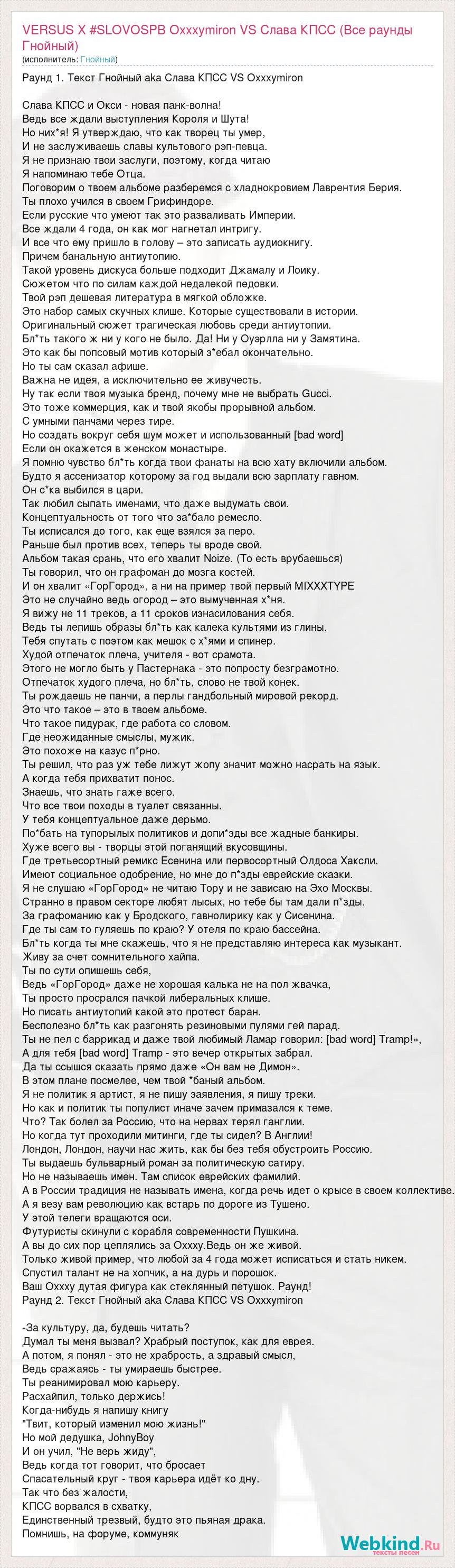 Раунд 1. Текст Гнойный aka Слава КПСС VS Oxxxymiron Слава КПСС и Окси - новая панк-волна! Ведь все ждали выступления Короля и Шута! Но них*я! Я утверждаю, что как творец ты умер, И не заслуживаешь славы культового рэп-певца. Я не признаю твои заслуги, поэтому, когда читаю Я напоминаю тебе Отца. Поговорим о твоем альбоме разберемся с хладнокровием Лаврентия Берия. Ты плохо учился в своем Грифиндоре. Если русские что умеют так это разваливать Империи. Все ждали 4 года, он как мог нагнетал интригу. И все что ему пришло в голову – это записать аудиокнигу. Причем банальную антиутопию. Такой уровень дискуса больше подходит Джамалу и Лоику. Сюжетом что по силам каждой недалекой педовки. Твой рэп дешевая литература в мягкой обложке. Это набор самых скучных клише. Которые существовали в истории. Оригинальный сюжет трагическая любовь среди антиутопии. Бл*ть такого ж ни у кого не было. Да! Ни у Оуэрлла ни у Замятина. Это как бы попсовый мотив который з*ебал окончательно. Но ты сам сказал афише. Важна не идея, а исключительно ее живучесть. Ну так если твоя музыка бренд, почему мне не выбрать Gucci. Это тоже коммерция, как и твой якобы прорывной альбом. С умными панчами через тире. Но создать вокруг себя шум может и использованный [bad word] Если он окажется в женском монастыре. Я помню чувство бл*ть когда твои фанаты на всю хату включили альбом. Будто я ассенизатор которому за год выдали всю зарплату гавном. Он с*ка выбился в цари. Так любил сыпать именами, что даже выдумать свои. Концептуальность от того что за*бало ремесло. Ты исписался до того, как еще взялся за перо. Раньше был против всех, теперь ты вроде свой. Альбом такая срань, что его хвалит Noize. (То есть врубаешься) Ты говорил, что он графоман до мозга костей. И он хвалит «ГорГород», а ни на пример твой первый MIXXXTYPE Это не случайно ведь огород – это вымученная х*ня. Я вижу не 11 треков, а 11 сроков изнасилования себя. Ведь ты лепишь образы бл*ть как калека культями из глины. Тебя спутать с поэтом как мешок с х*ями и спинер. Худой отпечаток плеча, учителя - вот срамота. Этого не могло быть у Пастернака - это попросту безграмотно. Отпечаток худого плеча, но бл*ть, слово не твой конек. Ты рождаешь не панчи, а перлы гандбольный мировой рекорд. Это что такое – это в твоем альбоме. Что такое пидурак, где работа со словом. Где неожиданные смыслы, мужик. Это похоже на казус п*рно. Ты решил, что раз уж тебе лижут жопу значит можно насрать на язык. А когда тебя прихватит понос. Знаешь, что знать гаже всего. Что все твои походы в туалет связанны. У тебя концептуальное даже дерьмо. По*бать на тупорылых политиков и допи*зды все жадные банкиры. Хуже всего вы - творцы этой поганящий вкусовщины. Где третьесортный ремикс Есенина или первосортный Олдоса Хаксли. Имеют социальное одобрение, но мне до п*зды еврейские сказки. Я не слушаю «ГорГород» не читаю Тору и не зависаю на Эхо Москвы. Странно в правом секторе любят лысых, но тебе бы там дали п*зды. За графоманию как у Бродского, гавнолирику как у Сисенина. Где ты сам то гуляешь по краю? У отеля по краю бассейна. Бл*ть когда ты мне скажешь, что я не представляю интереса как музыкант. Живу за счет сомнительного хайпа. Ты по сути опишешь себя, Ведь «ГорГород» даже не хорошая калька не на пол жвачка, Ты просто просрался пачкой либеральных клише. Но писать антиутопий какой это протест баран. Бесполезно бл*ть как разгон