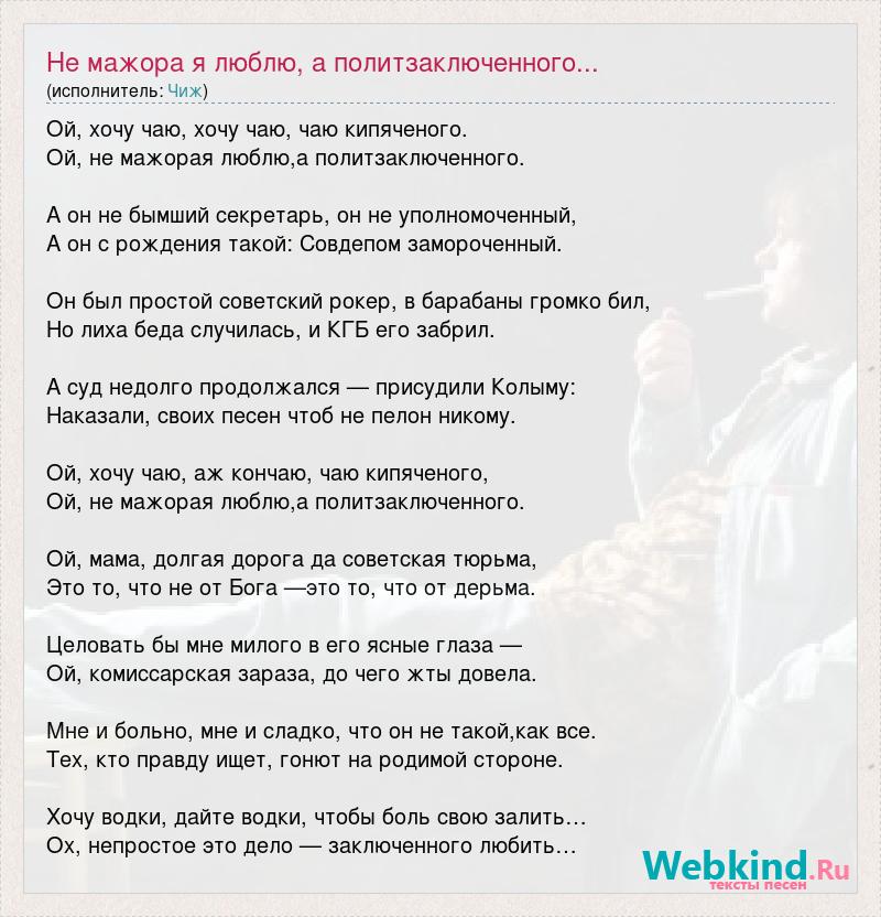 Ой, хочу чаю, хочу чаю, чаю кипяченого. Ой, не мажорая люблю,а политзаключенного. А он не бымший секретарь, он не уполномоченный, А он с рождения такой: Совдепом замороченный. Он был простой советский рокер, в барабаны громко бил, Но лиха беда случилась, и КГБ его забрил. А суд недолго продолжался — присудили Колыму: Наказали, своих песен чтоб не пелон никому. Ой, хочу чаю, аж кончаю, чаю кипяченого, Ой, не мажорая люблю,а политзаключенного. Ой, мама, долгая дорога да советская тюрьма, Это то, что не от Бога —это то, что от дерьма. Целовать бы мне милого в его ясные глаза — Ой, комиссарская зараза, до чего жты довела. Мне и больно, мне и сладко, что он не такой,как все. Тех, кто правду ищет, гонют на родимой стороне. Хочу водки, дайте водки, чтобы боль свою залить… Ох, непростое это дело — заключенного любить…