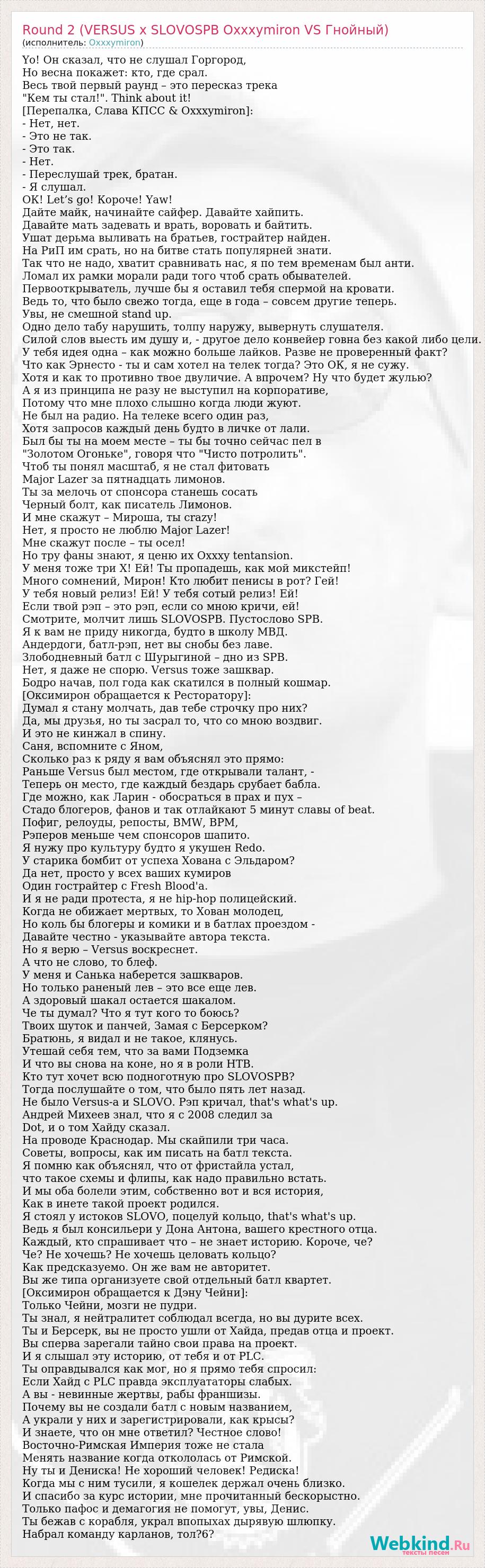 Yo! Он сказал, что не слушал Горгород, Но весна покажет: кто, где срал. Весь твой первый раунд – это пересказ трека "Кем ты стал!". Think about it! [Перепалка, Слава КПСС & Oxxxymiron]: - Нет, нет. - Это не так. - Это так. - Нет. - Переслушай трек, братан. - Я слушал. ОК! Let’s go! Короче! Yaw! Дайте майк, начинайте сайфер. Давайте хайпить. Давайте мать задевать и врать, воровать и байтить. Ушат дерьма выливать на братьев, гострайтер найден. На РиП им срать, но на битве стать популярней знати. Так что не надо, хватит сравнивать нас, я по тем временам был анти. Ломал их рамки морали ради того чтоб срать обывателей. Первооткрыватель, лучше бы я оставил тебя спермой на кровати. Ведь то, что было свежо тогда, еще в года – совсем другие теперь. Увы, не смешной stand up. Одно дело табу нарушить, толпу наружу, вывернуть слушателя. Силой слов выесть им душу и, - другое дело конвейер говна без какой либо цели. У тебя идея одна – как можно больше лайков. Разве не проверенный факт? Что как Эрнесто - ты и сам хотел на телек тогда? Это ОК, я не сужу. Хотя и как то противно твое двуличие. А впрочем? Ну что будет жулью? А я из принципа не разу не выступил на корпоративе, Потому что мне плохо слышно когда люди жуют. Не был на радио. На телеке всего один раз, Хотя запросов каждый день будто в личке от лали. Был бы ты на моем месте – ты бы точно сейчас пел в "Золотом Огоньке", говоря что "Чисто потролить". Чтоб ты понял масштаб, я не стал фитовать Major Lazer за пятнадцать лимонов. Ты за мелочь от спонсора станешь сосать Черный болт, как писатель Лимонов. И мне скажут – Мироша, ты crazy! Нет, я просто не люблю Major Lazer! Мне скажут после – ты осел! Но тру фаны знают, я ценю их Oxxxy tentansion. У меня тоже три X! Ей! Ты пропадешь, как мой микстейп! Много сомнений, Мирон! Кто любит пенисы в рот? Гей! У тебя новый релиз! Ей! У тебя сотый релиз! Ей! Если твой рэп – это рэп, если со мною кричи, ей! Смотрите, молчит лишь SLOVOSPB. Пустослово SPB. Я к вам не приду никогда, будто в школу МВД. Андердоги, батл-рэп, нет вы снобы без лаве. Злободневный батл с Шурыгиной – дно из SPB. Нет, я даже не спорю. Versus тоже зашквар. Бодро начав, пол года как скатился в полный кошмар. [Оксимирон обращается к Ресторатору]: Думал я стану молчать, дав тебе строчку про них? Да, мы друзья, но ты засрал то, что со мною воздвиг. И это не кинжал в спину. Саня, вспомните с Яном, Сколько раз к ряду я вам объяснял это прямо: Раньше Versus был местом, где открывали талант, - Теперь он место, где каждый бездарь срубает бабла. Где можно, как Ларин - обосраться в прах и пух – Стадо блогеров, фанов и так отлайкают 5 минут славы of beat. Пофиг, релоуды, репосты, BMW, BPM, Рэперов меньше чем спонсоров шапито. Я нужу про культуру будто я укушен Redo. У старика бомбит от успеха Хована с Эльдаром? Да нет, просто у всех ваших кумиров Один гострайтер с Fresh Blood'а. И я не ради протеста, я не hip-hop полицейский. Когда не обижает мертвых, то Хован молодец, Но коль бы блогеры и комики и в батлах проездом - Давайте честно - указывайте автора текста. Но я верю – Versus воскреснет. А что не слово, то блеф. У меня и Санька наберется зашкваров. Но только раненый лев – это все еще лев. А здоровый шакал остается шакалом. Че ты думал? Что я тут кого то боюсь? Твоих шуток и панчей, Замая с Берсерком? Братюнь, я видал и не такое, клянусь. Утешай себя тем, что за вами Подземка И что вы снова на коне, но я в роли НТВ. Кто тут хочет всю подноготную про SLOVOSPB? Тогда послушайте о том,