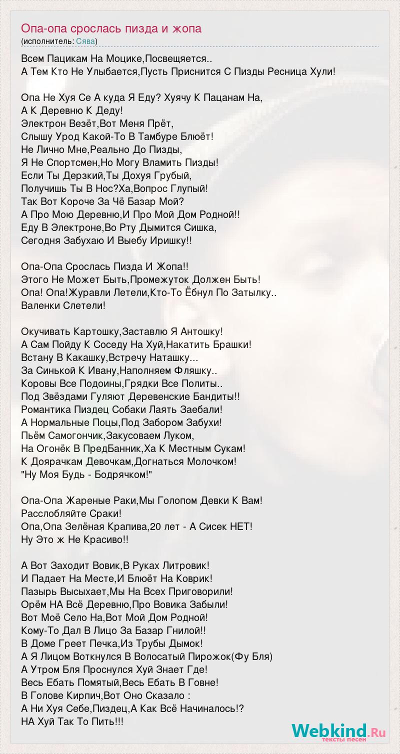 Всем Пацикам На Моцике,Посвещяется.. А Тем Кто Не Улыбается,Пусть Приснится С Пизды Ресница Хули! Опа Не Хуя Се А куда Я Еду? Хуячу К Пацанам На, А К Деревню К Деду! Электрон Везёт,Вот Меня Прёт, Слышу Урод Какой-То В Тамбуре Блюёт! Не Лично Мне,Реально До Пизды, Я Не Спортсмен,Но Могу Вламить Пизды! Если Ты Дерзкий,Ты Дохуя Грубый, Получишь Ты В Нос?Ха,Вопрос Глупый! Так Вот Короче За Чё Базар Мой? А Про Мою Деревню,И Про Мой Дом Родной!! Еду В Электроне,Во Рту Дымится Сишка, Сегодня Забухаю И Выебу Иришку!! Опа-Опа Срослась Пизда И Жопа!! Этого Не Может Быть,Промежуток Должен Быть! Опа! Опа!Журавли Летели,Кто-То Ёбнул По Затылку.. Валенки Слетели! Окучивать Картошку,Заставлю Я Антошку! А Сам Пойду К Соседу На Хуй,Накатить Брашки! Встану В Какашку,Встречу Наташку... За Синькой К Ивану,Наполняем Фляшку.. Коровы Все Подоины,Грядки Все Политы.. Под Звёздами Гуляют Деревенские Бандиты!! Романтика Пиздец Собаки Лаять Заебали! А Нормальные Поцы,Под Забором Забухи! Пьём Самогончик,Закусоваем Луком, На Огонёк В ПредБанник,Ха К Местным Сукам! К Доярачкам Девочкам,Догнаться Молочком! "Ну Моя Будь - Бодрячком!" Опа-Опа Жареные Раки,Мы Голопом Девки К Вам! Расслобляйте Сраки! Опа,Опа Зелёная Крапива,20 лет - А Сисек НЕТ! Ну Это ж Не Красиво!! А Вот Заходит Вовик,В Руках Литровик! И Падает На Месте,И Блюёт На Коврик! Пазырь Высыхает,Мы На Всех Приговорили! Орём НА Всё Деревню,Про Вовика Забыли! Вот Моё Село На,Вот Мой Дом Родной! Кому-То Дал В Лицо За Базар Гнилой!! В Доме Греет Печка,Из Трубы Дымок! А Я Лицом Воткнулся В Волосатый Пирожок(Фу Бля) А Утром Бля Проснулся Хуй Знает Где! Весь Ебать Помятый,Весь Ебать В Говне! В Голове Кирпич,Вот Оно Сказало : А Ни Хуя Себе,Пиздец,А Как Всё Начиналось!? НА Хуй Так То Пить!!!