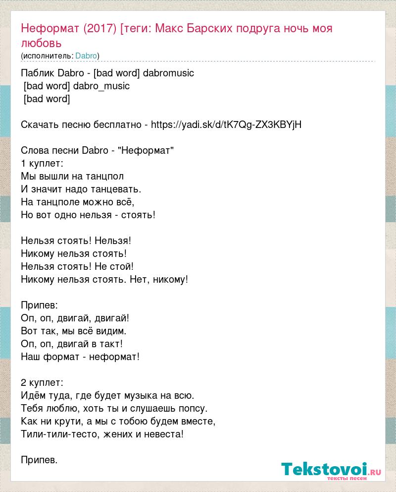 Паблик Dabro - [bad word] dabromusic [bad word] dabro_music [bad word] Скачать песню бесплатно - https://yadi.sk/d/tK7Qg-ZX3KBYjH Слова песни Dabro - "Неформат" 1 куплет: Мы вышли на танцпол И значит надо танцевать. На танцполе можно всё, Но вот одно нельзя - стоять! Нельзя стоять! Нельзя! Никому нельзя стоять! Нельзя стоять! Не стой! Никому нельзя стоять. Нет, никому! Припев: Оп, оп, двигай, двигай! Вот так, мы всё видим. Оп, оп, двигай в такт! Наш формат - неформат! 2 куплет: Идём туда, где будет музыка на всю. Тебя люблю, хоть ты и слушаешь попсу. Как ни крути, а мы с тобою будем вместе, Тили-тили-тесто, жених и невеста! Припев.