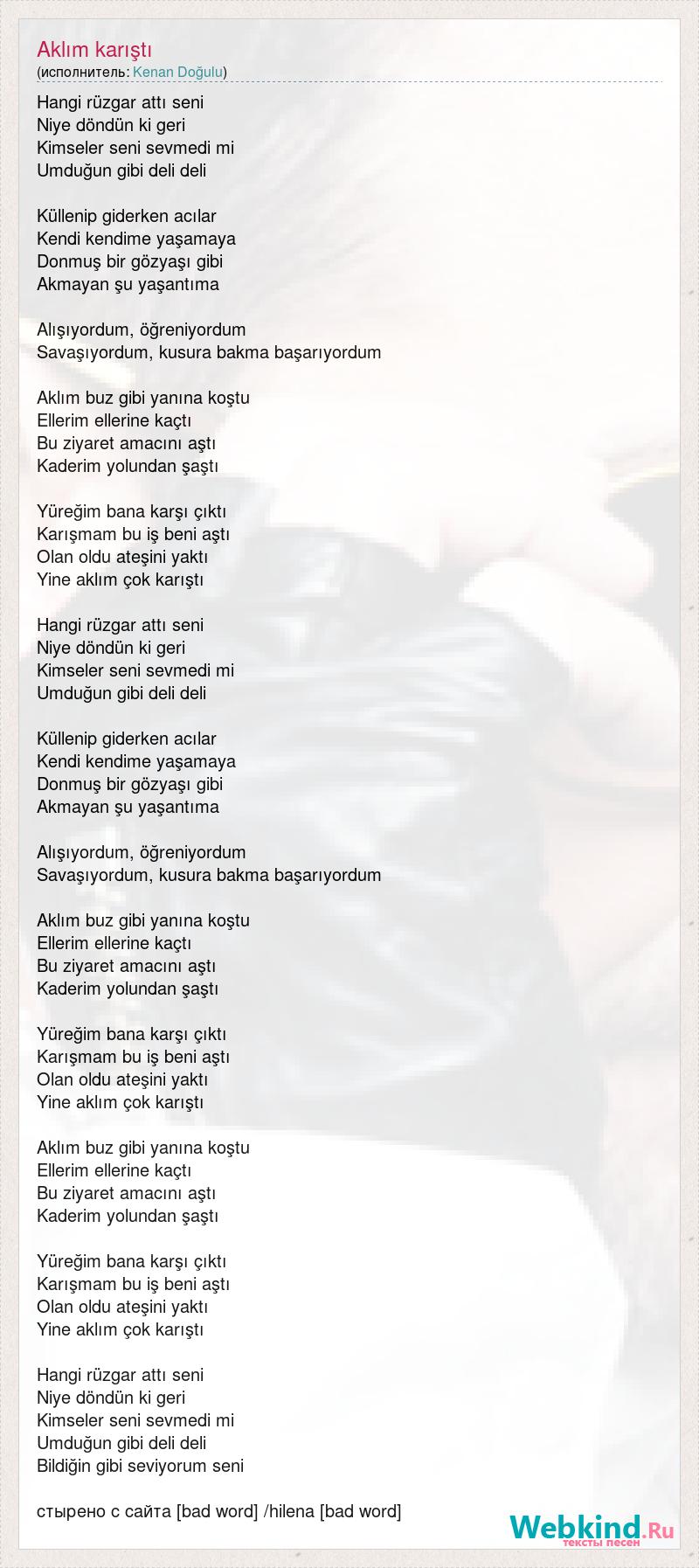 Hangi rüzgar attı seni Niye döndün ki geri Kimseler seni sevmedi mi Umduğun gibi deli deli Küllenip giderken acılar Kendi kendime yaşamaya Donmuş bir gözyaşı gibi Akmayan şu yaşantıma Alışıyordum, öğreniyordum Savaşıyordum, kusura bakma başarıyordum Aklım buz gibi yanına koştu Ellerim ellerine kaçtı Bu ziyaret amacını aştı Kaderim yolundan şaştı Yüreğim bana karşı çıktı Karışmam bu iş beni aştı Olan oldu ateşini yaktı Yine aklım çok karıştı Hangi rüzgar attı seni Niye döndün ki geri Kimseler seni sevmedi mi Umduğun gibi deli deli Küllenip giderken acılar Kendi kendime yaşamaya Donmuş bir gözyaşı gibi Akmayan şu yaşantıma Alışıyordum, öğreniyordum Savaşıyordum, kusura bakma başarıyordum Aklım buz gibi yanına koştu Ellerim ellerine kaçtı Bu ziyaret amacını aştı Kaderim yolundan şaştı Yüreğim bana karşı çıktı Karışmam bu iş beni aştı Olan oldu ateşini yaktı Yine aklım çok karıştı Aklım buz gibi yanına koştu Ellerim ellerine kaçtı Bu ziyaret amacını aştı Kaderim yolundan şaştı Yüreğim bana karşı çıktı Karışmam bu iş beni aştı Olan oldu ateşini yaktı Yine aklım çok karıştı Hangi rüzgar attı seni Niye döndün ki geri Kimseler seni sevmedi mi Umduğun gibi deli deli Bildiğin gibi seviyorum seni стырено с сайта [bad word] /hilena [bad word]