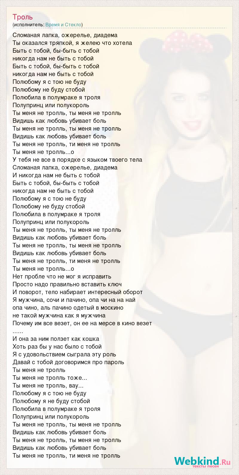 Сломаная лапка, ожерелье, диадема Ты оказался тряпкой, я желею что хотела Быть с тобой, бы-быть с тобой никогда нам не быть с тобой Быть с тобой, бы-быть с тобой никогда нам не быть с тобой Полюбому я с тою не буду Полюбому не буду стобой Полюбила в полумраке я троля Полупринц или полукороль Ты меня не тролль, ты меня не тролль Видишь как любовь убивает боль Ты меня не тролль, ты меня не тролль Видишь как любовь убивает боль Ты меня не тролль, ти меня не тролль Ты меня не тролль...о У тебя не все в порядке с языком твоего тела Сломаная лапка, ожерелье, диадема И никогда нам не быть с тобой Быть с тобой, бы-быть с тобой никогда нам не быть с тобой Полюбому я с тою не буду Полюбому не буду стобой Полюбила в полумраке я троля Полупринц или полукороль Ты меня не тролль, ты меня не тролль Видишь как любовь убивает боль Ты меня не тролль, ты меня не тролль Видишь как любовь убивает боль Ты меня не тролль, ти меня не тролль Ты меня не тролль...о Нет пробле что не мог я исправить Просто надо правильно вставить ключ И поворот, тело набирает интересный оборот Я мужчина, сочи и пачино, опа чи на на най опа чино, аль пачино одетый в москино не такой мужчина как я мужчина Почему им все везет, он ее на мерсе в кино везет ...... И она за ним ползет как кошка Хоть раз бы у нас было с тобой Я с удовольствием сыграла эту роль Давай с тобой договоримся про пароль Ты меня не тролль Ты меня не тролль тоже... Ты меня не тролль, вау... Полюбому я с тою не буду Полюбому я не буду стобой Полюбила в полумраке я троля Полупринц или полукороль Ты меня не тролль, ты меня не тролль Видишь как любовь убивает боль Ты меня не тролль, ты меня не тролль Видишь как любовь убивает боль Ты меня не тролль, ти меня не тролль
