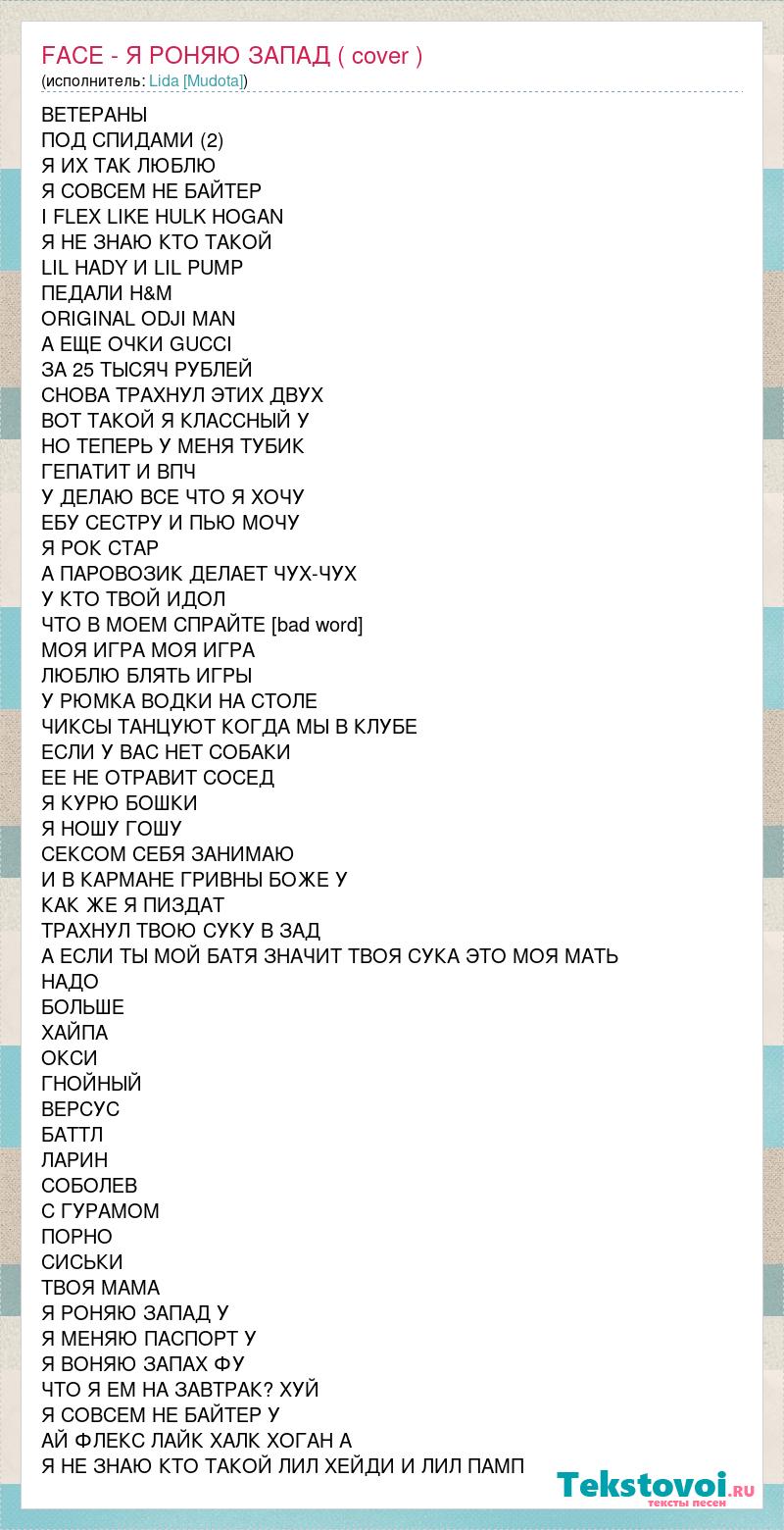 ВЕТЕРАНЫ ПОД СПИДАМИ (2) Я ИХ ТАК ЛЮБЛЮ Я СОВСЕМ НЕ БАЙТЕР I FLEX LIKE HULK HOGAN Я НЕ ЗНАЮ КТО ТАКОЙ LIL HADY И LIL PUMP ПЕДАЛИ H&M ORIGINAL ODJI MAN А ЕЩЕ ОЧКИ GUCCI ЗА 25 ТЫСЯЧ РУБЛЕЙ СНОВА ТРАХНУЛ ЭТИХ ДВУХ ВОТ ТАКОЙ Я КЛАССНЫЙ У НО ТЕПЕРЬ У МЕНЯ ТУБИК ГЕПАТИТ И ВПЧ У ДЕЛАЮ ВСЕ ЧТО Я ХОЧУ ЕБУ СЕСТРУ И ПЬЮ МОЧУ Я РОК СТАР А ПАРОВОЗИК ДЕЛАЕТ ЧУХ-ЧУХ У КТО ТВОЙ ИДОЛ ЧТО В МОЕМ СПРАЙТЕ [bad word] МОЯ ИГРА МОЯ ИГРА ЛЮБЛЮ БЛЯТЬ ИГРЫ У РЮМКА ВОДКИ НА СТОЛЕ ЧИКСЫ ТАНЦУЮТ КОГДА МЫ В КЛУБЕ ЕСЛИ У ВАС НЕТ СОБАКИ ЕЕ НЕ ОТРАВИТ СОСЕД Я КУРЮ БОШКИ Я НОШУ ГОШУ СЕКСОМ СЕБЯ ЗАНИМАЮ И В КАРМАНЕ ГРИВНЫ БОЖЕ У КАК ЖЕ Я ПИЗДАТ ТРАХНУЛ ТВОЮ СУКУ В ЗАД А ЕСЛИ ТЫ МОЙ БАТЯ ЗНАЧИТ ТВОЯ СУКА ЭТО МОЯ МАТЬ НАДО БОЛЬШЕ ХАЙПА ОКСИ ГНОЙНЫЙ ВЕРСУС БАТТЛ ЛАРИН СОБОЛЕВ С ГУРАМОМ ПОРНО СИСЬКИ ТВОЯ МАМА Я РОНЯЮ ЗАПАД У Я МЕНЯЮ ПАСПОРТ У Я ВОНЯЮ ЗАПАХ ФУ ЧТО Я ЕМ НА ЗАВТРАК? ХУЙ Я СОВСЕМ НЕ БАЙТЕР У АЙ ФЛЕКС ЛАЙК ХАЛК ХОГАН А Я НЕ ЗНАЮ КТО ТАКОЙ ЛИЛ ХЕЙДИ И ЛИЛ ПАМП