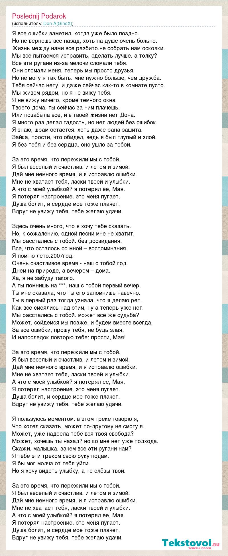 Я все ошибки заметил, когда уже было поздно. Но не вернешь все назад, хоть на душе очень больно. Жизнь между нами все разбито.не собрать нам осколки. Мы все пытаемся исправить, сделать лучше. а толку? Все эти ругани из-за мелочи сломали тебя. Они сломали меня. теперь мы просто друзья. Но не могу я так быть. мне нужно больше, чем дружба. Тебя сейчас нету. и даже сейчас как-то в комнате пусто. Мы живем рядом, но я не вижу тебя. Я не вижу ничего, кроме темного окна Твоего дома. ты сейчас за ним плачешь. Или позабыла все, и в твоей жизни нет Дона. Я много раз делал гадость, но нет людей без ошибок. Я знаю, шрам остается. хоть даже рана зашита. Зайка, прости, что обидел, ведь я был глупый и злой. Я без тебя и без сердца. оно ушло за тобой. За это время, что пережили мы с тобой. Я был веселый и счастлив. и летом и зимой. Дай мне немного время, и я исправлю ошибки. Мне не хватает тебя, ласки твоей и улыбки. А что с моей улыбкой? я потерял ее, Мая. Я потерял настроение. это меня пугает. Душа болит, и сердце мое тоже плачет. Вдруг не увижу тебя. тебе желаю удачи. Здесь очень много, что я хочу тебе сказать. Но, к сожалению, одной песни мне не хватит. Мы расстались с тобой. без досвидания. Все, что осталось со мной – воспоминания. Я помню лето.2007год. Очень счастливое время - наш с тобой год. Днем на природе, а вечером – дома. Ха, я не забуду такого. А ты помнишь на ***. наш с тобой первый вечер. Ты мне сказала, что ты его запомнишь навечно. Ты в первый раз тогда узнала, что я делаю реп. Как все смеялись над этим, ну а теперь уже нет. Мы расстались с тобой. может все же судьба? Может, сойдемся мы позже, и будем вместе всегда. За все ошибки, прошу тебя, не будь злая. И напоследок повторю тебе: прости, Мая! За это время, что пережили мы с тобой. Я был веселый и счастлив. и летом и зимой. Дай мне немного время, и я исправлю ошибки. Мне не хватает тебя, ласки твоей и улыбки. А что с моей улыбкой? я потерял ее, Мая. Я потерял настроение. это меня пугает. Душа болит, и сердце мое тоже плачет. Вдруг не увижу тебя. тебе желаю удачи. Я пользуюсь моментом. в этом треке говорю я, Что хотел сказать, может по-другому не смогу я. Может, уже надоела тебе вся твоя свобода? Может, хочешь ты назад? но ко мне нет уже подхода. Скажи, малышка, зачем все эти ругани нам? Я тебе эти треком свою руку подам. Я бы мог молча от тебя уйти. Но я хочу видеть улыбку, а не слёзы твои. За это время, что пережили мы с тобой. Я был веселый и счастлив. и летом и зимой. Дай мне немного время, и я исправлю ошибки. Мне не хватает тебя, ласки твоей и улыбки. А что с моей улыбкой? я потерял ее, Мая. Я потерял настроение. это меня пугает. Душа болит, и сердце мое тоже плачет. Вдруг не увижу тебя. тебе желаю удачи.