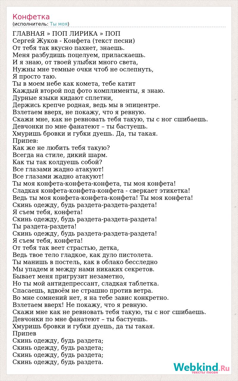 ГЛАВНАЯ » ПОП ЛИРИКА » ПОП Сергей Жуков - Конфета (текст песни) От тебя так вкусно пахнет, знаешь. Меня разбудишь поцелуем, приласкаешь. И я знаю, от твоей улыбки много света, Нужны мне темные очки чтоб не ослепнуть, Я просто таю. Ты в моем небе как комета, тебе катит Каждый второй под фото комплименты, я знаю. Дурные языки кидают сплетни, Держись крепче родная, ведь мы в эпицентре. Взлетаем вверх, не покажу, что я ревную. Скажи мне, как не ревновать тебя такую, ты с ног сшибаешь. Девчонки по мне фанатеют – ты бастуешь. Хмуришь бровки и губки дуешь. Да, ты такая. Припев: Как же не любить тебя такую? Всегда на стиле, дикий шарм. Как ты так колдуешь собой? Все глазами жадно атакуют! Все глазами жадно атакуют! Ты моя конфета-конфета-конфета, ты моя конфета! Сладкая конфета-конфета-конфета - сверкает этикетка! Ведь ты моя конфета-конфета-конфета! Ты моя конфета! Скинь одежду, будь раздета-раздета-раздета! Я съем тебя, конфета! Скинь одежду, будь раздета-раздета-раздета! Ты раздета-раздета! Скинь одежду, будь раздета-раздета-раздета! Я съем тебя, конфета! От тебя так веет страстью, детка, Ведь твое тело гладкое, как дуло пистолета. Ты манишь в постель, как в облако бесследно Мы упадем и между нами никаких секретов. Бывает меня пригрузит незаметно, Но ты мой антидепрессант, сладкая таблетка. Спасаешь, вдвоём не страшно против ветра. Во мне сомнений нет, я на тебе завис конкретно. Взлетаем вверх! Не покажу, что я ревную. Скажи мне как не ревновать тебя такую, ты с ног сшибаешь. Девчонки по мне фанатеют – ты бастуешь. Хмуришь бровки и губки дуешь, да ты такая. Припев Скинь одежду, будь раздета; Скинь одежду, будь раздета; Скинь одежду, будь раздета; Скинь одежду, будь раздета.