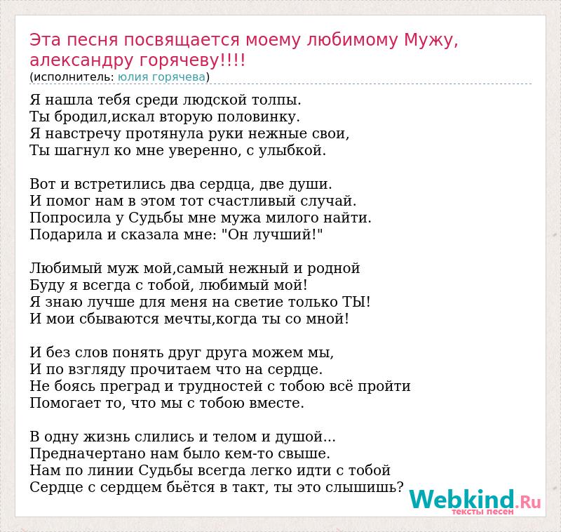 Я нашла тебя среди людской толпы. Ты бродил,искал вторую половинку. Я навстречу протянула руки нежные свои, Ты шагнул ко мне уверенно, с улыбкой. Вот и встретились два сердца, две души. И помог нам в этом тот счастливый случай. Попросила у Судьбы мне мужа милого найти. Подарила и сказала мне: "Он лучший!" Любимый муж мой,самый нежный и родной Буду я всегда с тобой, любимый мой! Я знаю лучше для меня на светие только ТЫ! И мои сбываются мечты,когда ты со мной! И без слов понять друг друга можем мы, И по взгляду прочитаем что на сердце. Не боясь преград и трудностей с тобою всё пройти Помогает то, что мы с тобою вместе. В одну жизнь слились и телом и душой... Предначертано нам было кем-то свыше. Нам по линии Судьбы всегда легко идти с тобой Сердце с сердцем бьётся в такт, ты это слышишь?