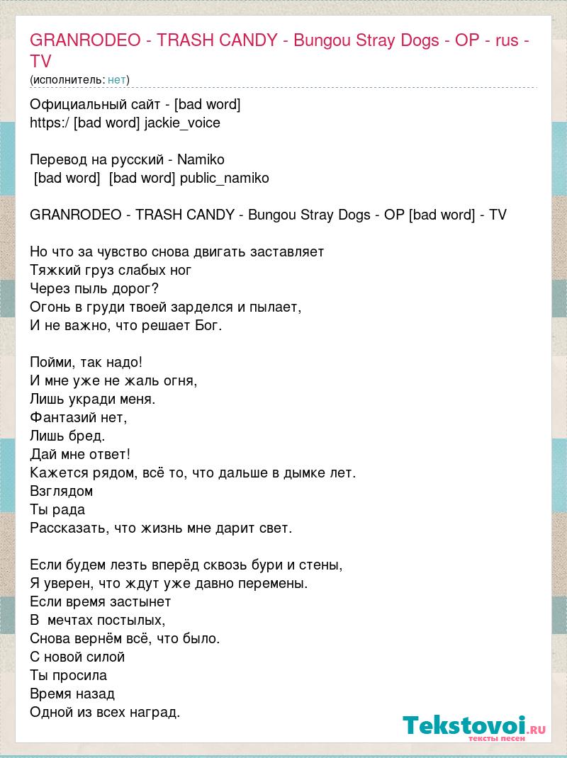 Официальный сайт - [bad word] https:/ [bad word] jackie_voice Перевод на русский - Namiko [bad word] [bad word] public_namiko GRANRODEO - TRASH CANDY - Bungou Stray Dogs - OP [bad word] - TV Но что за чувство снова двигать заставляет Тяжкий груз слабых ног Через пыль дорог? Огонь в груди твоей зарделся и пылает, И не важно, что решает Бог. Пойми, так надо! И мне уже не жаль огня, Лишь укради меня. Фантазий нет, Лишь бред. Дай мне ответ! Кажется рядом, всё то, что дальше в дымке лет. Взглядом Ты рада Рассказать, что жизнь мне дарит свет. Если будем лезть вперёд сквозь бури и стены, Я уверен, что ждут уже давно перемены. Если время застынет В мечтах постылых, Снова вернём всё, что было. С новой силой Ты просила Время назад Одной из всех наград.