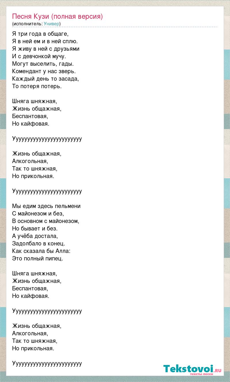 Я три года в общаге, Я в ней ем и в ней сплю. Я живу в ней с друзьями И с девчонкой мучу. Могут выселить, гады. Комендант у нас зверь. Каждый день то засада, То потеря потерь. Шняга шняжная, Жизнь общажная, Беспантовая, Но кайфовая. Уууууууууууууууууууууууу Жизнь общажная, Алкогольная, Так то шняжная, Но прикольная. Уууууууууууууууууууууууу Мы едим здесь пельмени С майонезом и без, В основном с майонезом, Но бывает и без. А учёба достала, Задолбало в конец. Как сказала бы Алла: Это полный пипец. Шняга шняжная, Жизнь общажная, Беспантовая, Но кайфовая. Уууууууууууууууууууууууу Жизнь общажная, Алкогольная, Так то шняжная, Но прикольная. Уууууууууууууууууууууууу