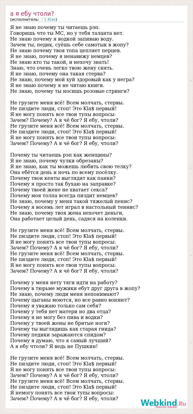 Я не знаю почему ты читаешь рэп. Говоришь что ты MC, но у тебя таланта нет. Не знаю почему я водкой запиваю воду. Зачем ты, педик, суёшь себе самотык в жопу? Не знаю почему твоя топа цепляет перцев. Я не знаю, почему я ненавижу немцев? Не знаю кто ты такой, и нехочу знать! Знаю, что очень легко твою жену снять. Я не знаю, почему она такая стерва? Не знаю, почему мой хуй здоровый как у негра? Я не знаю почему я не читаю книги. Не знаю, почему ты носишь розовые стринги? Не грузите меня всё! Всем молчать, стервы. Не пиздите люди, стоп! Это Kla$ первый! Я не могу понять все твои тупы вопросы: Зачем? Почему? А я чё бог? Я ебу, чтоли? Не грузите меня всё! Всем молчать, стервы. Не пиздите люди, стоп! Это Kla$ первый! Я не могу понять все твои тупы вопросы: Зачем? Почему? А я чё бог? Я ебу, чтоли? Почему ты читаешь рэп как женщины? Я не знаю, почему чулки обрезаны? Я не знаю, как ты можешь любить свою телку? Она ебётся день и ночь по всему посёлку. Почему твои кенты выглядят как панки? Почему я просто так бухаю на заправке? Почему твоей жене не хватает секса? Почему моя толпа всегда пиздит немцев? Не знаю, почему у меня такой тяжелый пенис? Почему я восемь лет играл в настольный теннис? Не знаю, почему твоя жена нехочет деньги, Она работает целый день, садяся на коленки. Не грузите меня всё! Всем молчать, стервы. Не пиздите люди, стоп! Это Kla$ первый! Я не могу понять все твои тупы вопросы: Зачем? Почему? А я чё бог? Я ебу, чтоли? Не грузите меня всё! Всем молчать, стервы. Не пиздите люди, стоп! Это Kla$ первый! Я не могу понять все твои тупы вопросы: Зачем? Почему? А я чё бог? Я ебу, чтоли? Почему у меня нету тяги идти на работу? Почему в тюрьме мужики ебут друг друга в жопу? Не знаю, почему люди меня непонимают? Почему цыганы моются, но все равно воняют? Почему я уважаю только сам себя? Почему у тебя нет матери но два отца? Почему я не могу без пива и водки? Почему у твоей жены не бритые ноги? Почему ты выглядишь как старая гнида? Почему педики заражаются спидом? Почему я думаю, что я самый лучший? А я ебу чтоли? Я ведь не Пушкин! Не грузите меня всё! Всем молчать, стервы. Не пиздите люди, стоп! Это Kla$ первый! Я не могу понять все твои тупы вопросы: Зачем? Почему? А я чё бог? Я ебу, чтоли? Не грузите меня всё! Всем молчать, стервы. Не пиздите люди, стоп! Это Kla$ первый! Я немогу понять все твои тупы вопросы: Зачем? Почему? А я чё бог? Я ебу, чтоли?