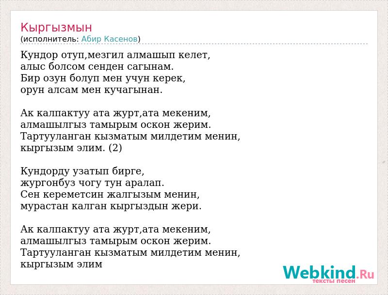 Кундор отуп,мезгил алмашып келет, алыс болсом сенден сагынам. Бир озун болуп мен учун керек, орун алсам мен кучагынан. Ак калпактуу ата журт,ата мекеним, алмашылгыз тамырым оскон жерим. Тартууланган кызматым милдетим менин, кыргызым элим. (2) Кундорду узатып бирге, жургонбуз чогу тун аралап. Сен кереметсин жалгызым менин, мурастан калган кыргыздын жери. Ак калпактуу ата журт,ата мекеним, алмашылгыз тамырым оскон жерим. Тартууланган кызматым милдетим менин, кыргызым элим