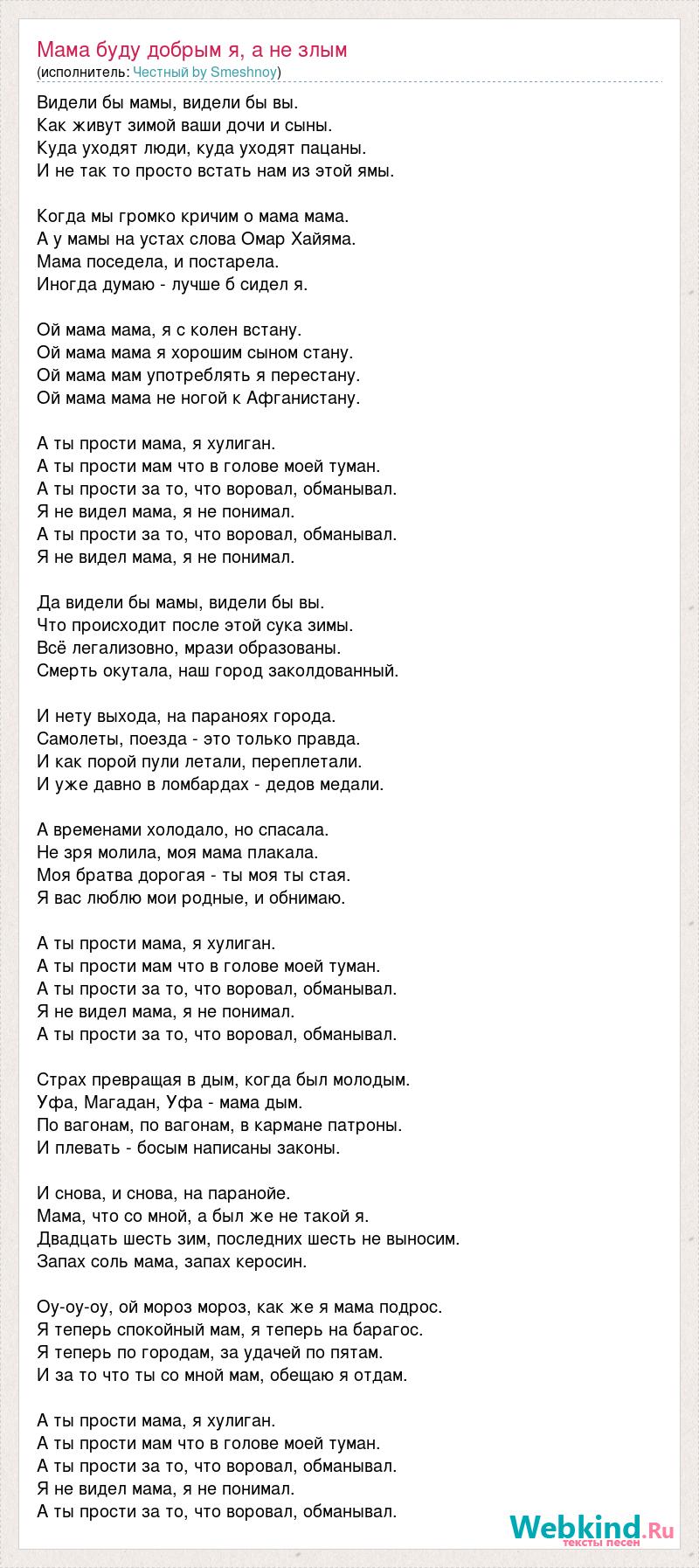 Видели бы мамы, видели бы вы. Как живут зимой ваши дочи и сыны. Куда уходят люди, куда уходят пацаны. И не так то просто встать нам из этой ямы. Когда мы громко кричим о мама мама. А у мамы на устах слова Омар Хайяма. Мама поседела, и постарела. Иногда думаю - лучше б сидел я. Ой мама мама, я с колен встану. Ой мама мама я хорошим сыном стану. Ой мама мам употреблять я перестану. Ой мама мама не ногой к Афганистану. А ты прости мама, я хулиган. А ты прости мам что в голове моей туман. А ты прости за то, что воровал, обманывал. Я не видел мама, я не понимал. А ты прости за то, что воровал, обманывал. Я не видел мама, я не понимал. Да видели бы мамы, видели бы вы. Что происходит после этой сука зимы. Всё легализовно, мрази образованы. Смерть окутала, наш город заколдованный. И нету выхода, на параноях города. Самолеты, поезда - это только правда. И как порой пули летали, переплетали. И уже давно в ломбардах - дедов медали. А временами холодало, но спасала. Не зря молила, моя мама плакала. Моя братва дорогая - ты моя ты стая. Я вас люблю мои родные, и обнимаю. А ты прости мама, я хулиган. А ты прости мам что в голове моей туман. А ты прости за то, что воровал, обманывал. Я не видел мама, я не понимал. А ты прости за то, что воровал, обманывал. Страх превращая в дым, когда был молодым. Уфа, Магадан, Уфа - мама дым. По вагонам, по вагонам, в кармане патроны. И плевать - босым написаны законы. И снова, и снова, на паранойе. Мама, что со мной, а был же не такой я. Двадцать шесть зим, последних шесть не выносим. Запах соль мама, запах керосин. Оу-оу-оу, ой мороз мороз, как же я мама подрос. Я теперь спокойный мам, я теперь на барагос. Я теперь по городам, за удачей по пятам. И за то что ты со мной мам, обещаю я отдам. А ты прости мама, я хулиган. А ты прости мам что в голове моей туман. А ты прости за то, что воровал, обманывал. Я не видел мама, я не понимал. А ты прости за то, что воровал, обманывал.