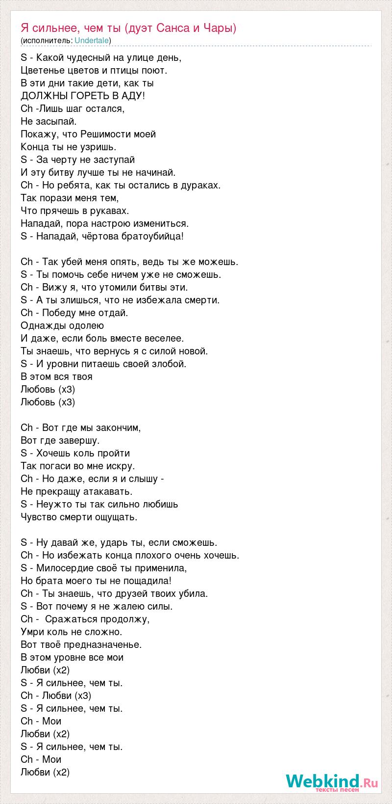 S - Какой чудесный на улице день, Цветенье цветов и птицы поют. В эти дни такие дети, как ты ДОЛЖНЫ ГОРЕТЬ В АДУ! Ch -Лишь шаг остался, Не засыпай. Покажу, что Решимости моей Конца ты не узришь. S - За черту не заступай И эту битву лучше ты не начинай. Ch - Но ребята, как ты остались в дураках. Так порази меня тем, Что прячешь в рукавах. Нападай, пора настрою измениться. S - Нападай, чёртова братоубийца! Ch - Так убей меня опять, ведь ты же можешь. S - Ты помочь себе ничем уже не сможешь. Ch - Вижу я, что утомили битвы эти. S - А ты злишься, что не избежала смерти. Ch - Победу мне отдай. Однажды одолею И даже, если боль вместе веселее. Ты знаешь, что вернусь я с силой новой. S - И уровни питаешь своей злобой. В этом вся твоя Любовь (х3) Любовь (х3) Ch - Вот где мы закончим, Вот где завершу. S - Хочешь коль пройти Так погаси во мне искру. Ch - Но даже, если я и слышу - Не прекращу атакавать. S - Неужто ты так сильно любишь Чувство смерти ощущать. S - Ну давай же, ударь ты, если сможешь. Ch - Но избежать конца плохого очень хочешь. S - Милосердие своё ты применила, Но брата моего ты не пощадила! Ch - Ты знаешь, что друзей твоих убила. S - Вот почему я не жалею силы. Ch - Сражаться продолжу, Умри коль не сложно. Вот твоё предназначенье. В этом уровне все мои Любви (х2) S - Я сильнее, чем ты. Ch - Любви (х3) S - Я сильнее, чем ты. Ch - Мои Любви (х2) S - Я сильнее, чем ты. Ch - Мои Любви (х2)