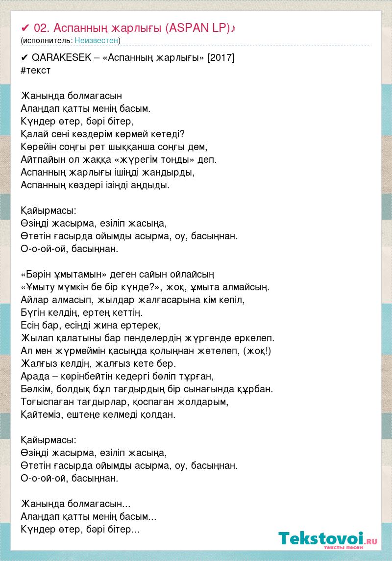 ✔ QARAKESEK – «Аспанның жарлығы» [2017] #текст Жаныңда болмағасын Алаңдап қатты менің басым. Күндер өтер, бәрі бітер, Қалай сені көздерім көрмей кетеді? Көрейін соңғы рет шыққанша соңғы дем, Айтпайын ол жаққа «жүрегім тоңды» деп. Аспанның жарлығы ішіңді жандырды, Аспанның көздері ізіңді аңдыды. Қайырмасы: Өзіңді жасырма, езіліп жасыңа, Өтетін ғасырда ойымды асырма, оу, басыңнан. О-о-ой-ой, басыңнан. «Бәрін ұмытамын» деген сайын ойлайсың «Ұмыту мүмкін бе бір күнде?», жоқ, ұмыта алмайсың. Айлар алмасып, жылдар жалғасарына кім кепіл, Бүгін келдің, ертең кеттің. Есің бар, есіңді жина ертерек, Жылап қалатыны бар пенделердің жүргенде еркелеп. Ал мен жүрмеймін қасыңда қолыңнан жетелеп, (жоқ!) Жалғыз келдің, жалғыз кете бер. Арада – көрінбейтін кедергі бөліп тұрған, Бәлкім, болдық бұл тағдырдың бір сынағында құрбан. Тоғыспаған тағдырлар, қоспаған жолдарым, Қайтеміз, ештеңе келмеді қолдан. Қайырмасы: Өзіңді жасырма, езіліп жасыңа, Өтетін ғасырда ойымды асырма, оу, басыңнан. О-о-ой-ой, басыңнан. Жаныңда болмағасын... Алаңдап қатты менің басым... Күндер өтер, бәрі бітер...