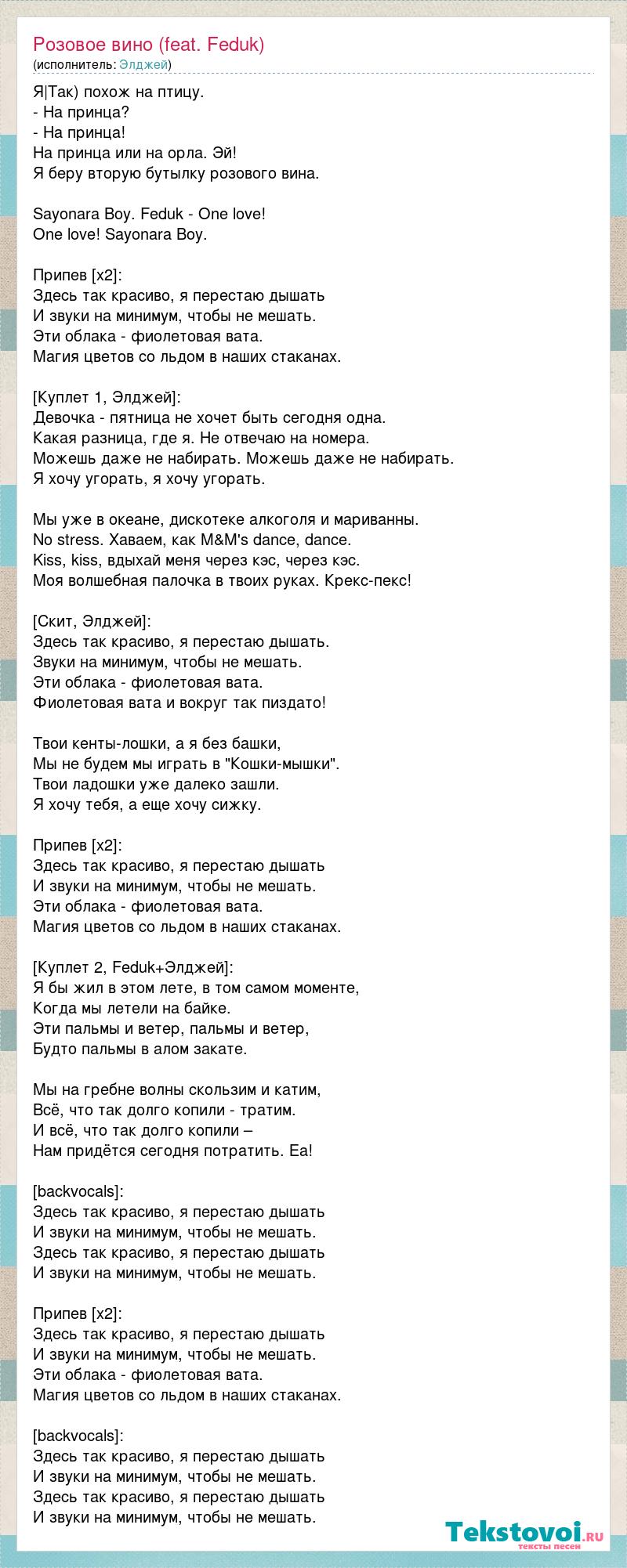 Я|Так) похож на птицу. - На принца? - На принца! На принца или на орла. Эй! Я беру вторую бутылку розового вина. Sayonara Boy. Feduk - One love! One love! Sayonara Boy. Припев [x2]: Здесь так красиво, я перестаю дышать И звуки на минимум, чтобы не мешать. Эти облака - фиолетовая вата. Магия цветов со льдом в наших стаканах. [Куплет 1, Элджей]: Девочка - пятница не хочет быть сегодня одна. Какая разница, где я. Не отвечаю на номера. Можешь даже не набирать. Можешь даже не набирать. Я хочу угорать, я хочу угорать. Мы уже в океане, дискотеке алкоголя и мариванны. No stress. Хаваем, как M&M's dance, dance. Kiss, kiss, вдыхай меня через кэс, через кэс. Моя волшебная палочка в твоих руках. Крекс-пекс! [Скит, Элджей]: Здесь так красиво, я перестаю дышать. Звуки на минимум, чтобы не мешать. Эти облака - фиолетовая вата. Фиолетовая вата и вокруг так пиздато! Твои кенты-лошки, а я без башки, Мы не будем мы играть в "Кошки-мышки". Твои ладошки уже далеко зашли. Я хочу тебя, а еще хочу сижку. Припев [x2]: Здесь так красиво, я перестаю дышать И звуки на минимум, чтобы не мешать. Эти облака - фиолетовая вата. Магия цветов со льдом в наших стаканах. [Куплет 2, Feduk+Элджей]: Я бы жил в этом лете, в том самом моменте, Когда мы летели на байке. Эти пальмы и ветер, пальмы и ветер, Будто пальмы в алом закате. Мы на гребне волны скользим и катим, Всё, что так долго копили - тратим. И всё, что так долго копили – Нам придётся сегодня потратить. Еа! [backvocals]: Здесь так красиво, я перестаю дышать И звуки на минимум, чтобы не мешать. Здесь так красиво, я перестаю дышать И звуки на минимум, чтобы не мешать. Припев [x2]: Здесь так красиво, я перестаю дышать И звуки на минимум, чтобы не мешать. Эти облака - фиолетовая вата. Магия цветов со льдом в наших стаканах. [backvocals]: Здесь так красиво, я перестаю дышать И звуки на минимум, чтобы не мешать. Здесь так красиво, я перестаю дышать И звуки на минимум, чтобы не мешать.