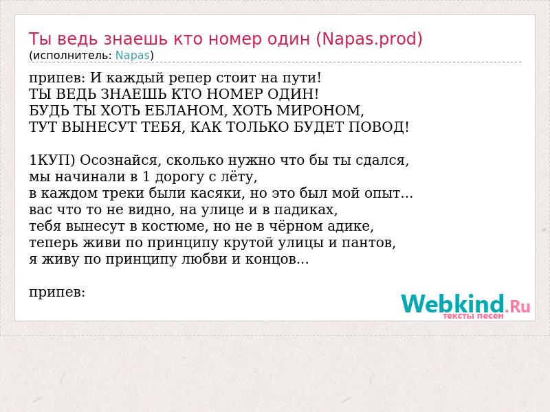 А как ты думаешь, о чем песня "Ты ведь знаешь кто номер один (Napas.prod)" ?