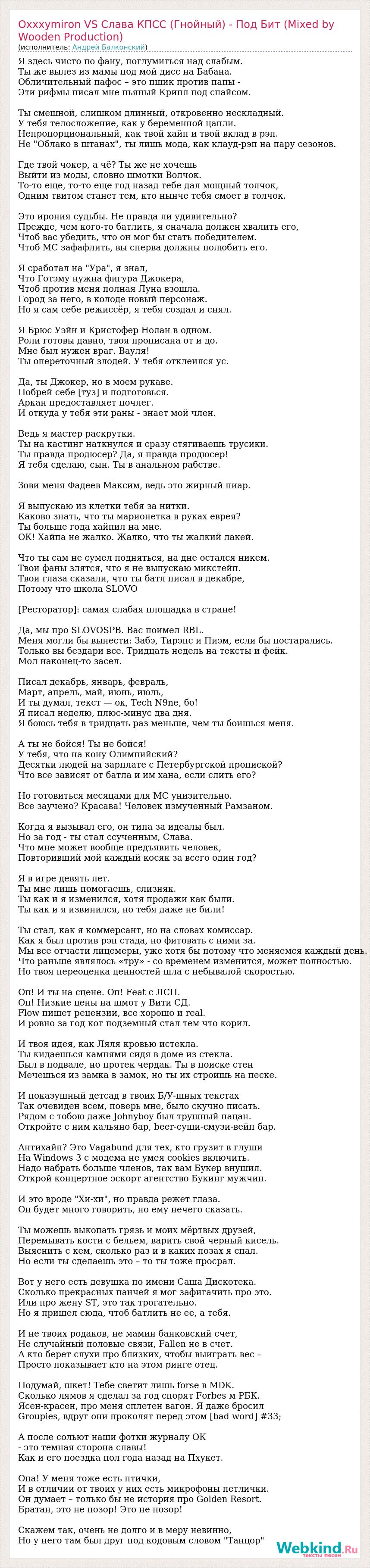 Я здесь чисто по фану, поглумиться над слабым. Ты же вылез из мамы под мой дисс на Бабана. Обличительный пафос – это пшик против папы - Эти рифмы писал мне пьяный Крипл под спайсом. Ты смешной, слишком длинный, откровенно нескладный. У тебя телосложение, как у беременной цапли. Непропорциональный, как твой хайп и твой вклад в рэп. Не "Облако в штанах", ты лишь мода, как клауд-рэп на пару сезонов. Где твой чокер, а чё? Ты же не хочешь Выйти из моды, словно шмотки Волчок. То-то еще, то-то еще год назад тебе дал мощный толчок, Одним твитом станет тем, кто нынче тебя смоет в толчок. Это ирония судьбы. Не правда ли удивительно? Прежде, чем кого-то батлить, я сначала должен хвалить его, Чтоб вас убедить, что он мог бы стать победителем. Чтоб МС зафафлить, вы сперва должны полюбить его. Я сработал на "Ура", я знал, Что Готэму нужна фигура Джокера, Чтоб против меня полная Луна взошла. Город за него, в колоде новый персонаж. Но я сам себе режиссёр, я тебя создал и снял. Я Брюс Уэйн и Кристофер Нолан в одном. Роли готовы давно, твоя прописана от и до. Мне был нужен враг. Вауля! Ты опереточный злодей. У тебя отклеился ус. Да, ты Джокер, но в моем рукаве. Побрей себе [туз] и подготовься. Аркан предоставляет почлег. И откуда у тебя эти раны - знает мой член. Ведь я мастер раскрутки. Ты на кастинг наткнулся и сразу стягиваешь трусики. Ты правда продюсер? Да, я правда продюсер! Я тебя сделаю, сын. Ты в анальном рабстве. Зови меня Фадеев Максим, ведь это жирный пиар. Я выпускаю из клетки тебя за нитки. Каково знать, что ты марионетка в руках еврея? Ты больше года хайпил на мне. ОК! Хайпа не жалко. Жалко, что ты жалкий лакей. Что ты сам не сумел подняться, на дне остался никем. Твои фаны злятся, что я не выпускаю микстейп. Твои глаза сказали, что ты батл писал в декабре, Потому что школа SLOVO [Ресторатор]: самая слабая площадка в стране! Да, мы про SLOVOSPB. Вас поимел RBL. Меня могли бы вынести: Забэ, Тирэпс и Пиэм, если бы постарались. Только вы бездари все. Тридцать недель на тексты и фейк. Мол наконец-то засел. Писал декабрь, январь, февраль, Март, апрель, май, июнь, июль, И ты думал, текст — ок, Tech N9ne, бо! Я писал неделю, плюс-минус два дня. Я боюсь тебя в тридцать раз меньше, чем ты боишься меня. А ты не бойся! Ты не бойся! У тебя, что на кону Олимпийский? Десятки людей на зарплате с Петербургской пропиской? Что все зависят от батла и им хана, если слить его? Но готовиться месяцами для МС унизительно. Все заучено? Красава! Человек измученный Рамзаном. Когда я вызывал его, он типа за идеалы был. Но за год - ты стал ссученным, Слава. Что мне может вообще предъявить человек, Повторивший мой каждый косяк за всего один год? Я в игре девять лет. Ты мне лишь помогаешь, слизняк. Ты как и я изменился, хотя продажи как были. Ты как и я извинился, но тебя даже не били! Ты стал, как я коммерсант, но на словах комиссар. Как я был против рэп стада, но фитовать с ними за. Мы все отчасти лицемеры, уже хотя бы потому что меняемся каждый день. Что раньше являлось «тру» - со временем изменится, может полностью. Но твоя переоценка ценностей шла с небывалой скоростью. Оп! И ты на сцене. Оп! Feat с ЛСП. Оп! Низкие цены на шмот у Вити СД. Flow пишет рецензии, все хорошо и real. И ровно за год кот подземный стал тем что корил. И твоя идея, как Ляля кровью истекла. Ты кидаешься камнями сидя в доме из стекла. Был в подвале, но протек чердак. Ты в поиске стен Мечешься из зам