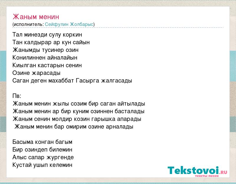 Тал минезди сулу коркин Тан калдырар ар кун сайын Жанымды тусинер озин Конилиннен айналайын Киылган кастарын сенин Озине жарасады Саган деген махаббат Гасырга жалгасады Пв: Жаным менин жылы созим бир саган айтылады Жаным менин ар бир куним озиннен басталады Жаным сенин молдир козин гарышка апарады Жаным менин бар омирим озине арналады Басыма конган багым Бир озиндеп билемин Алыс сапар жургенде Кустай ушып келемин