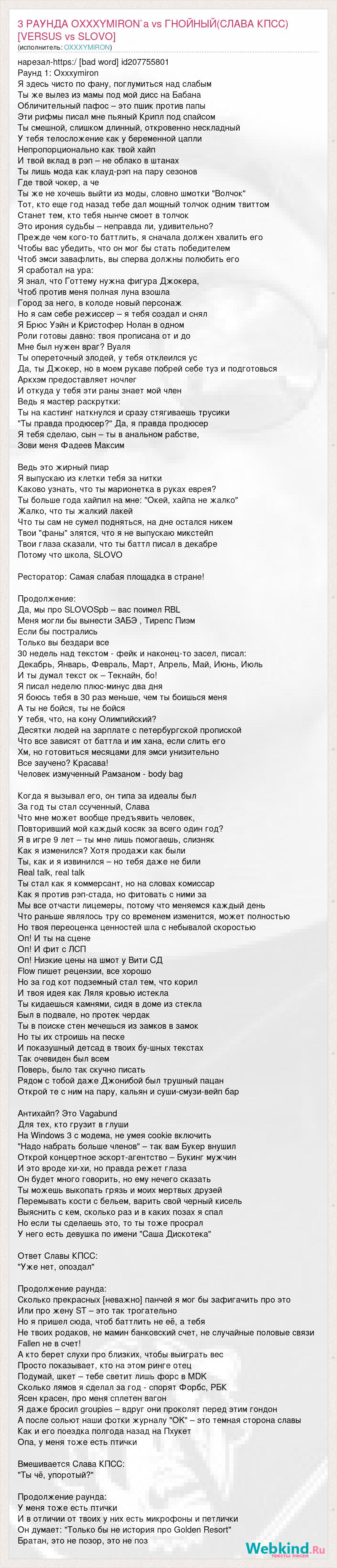 нарезал-https:/ [bad word] id207755801 Раунд 1: Oxxxymiron Я здесь чисто по фану, поглумиться над слабым Ты же вылез из мамы под мой дисс на Бабана Обличительный пафос – это пшик против папы Эти рифмы писал мне пьяный Крипл под спайсом Ты смешной, слишком длинный, откровенно нескладный У тебя телосложение как у беременной цапли Непропорционально как твой хайп И твой вклад в рэп – не облако в штанах Ты лишь мода как клауд-рэп на пару сезонов Где твой чокер, а че Ты же не хочешь выйти из моды, словно шмотки "Волчок" Тот, кто еще год назад тебе дал мощный толчок одним твиттом Станет тем, кто тебя нынче смоет в толчок Это ирония судьбы – неправда ли, удивительно? Прежде чем кого-то баттлить, я сначала должен хвалить его Чтобы вас убедить, что он мог бы стать победителем Чтоб эмси завафлить, вы сперва должны полюбить его Я сработал на ура: Я знал, что Готтему нужна фигура Джокера, Чтоб против меня полная луна взошла Город за него, в колоде новый персонаж Но я сам себе режиссер – я тебя создал и снял Я Брюс Уэйн и Кристофер Нолан в одном Роли готовы давно: твоя прописана от и до Мне был нужен враг? Вуаля Ты опереточный злодей, у тебя отклеился ус Да, ты Джокер, но в моем рукаве побрей себе туз и подготовься Аркхэм предоставляет ночлег И откуда у тебя эти раны знает мой член Ведь я мастер раскрутки: Ты на кастинг наткнулся и сразу стягиваешь трусики "Ты правда продюсер?" Да, я правда продюсер Я тебя сделаю, сын – ты в анальном рабстве, Зови меня Фадеев Максим Ведь это жирный пиар Я выпускаю из клетки тебя за нитки Каково узнать, что ты марионетка в руках еврея? Ты больше года хайпил на мне: "Окей, хайпа не жалко" Жалко, что ты жалкий лакей Что ты сам не сумел подняться, на дне остался никем Твои "фаны" злятся, что я не выпускаю микстейп Твои глаза сказали, что ты баттл писал в декабре Потому что школа, SLOVO Ресторатор: Самая слабая площадка в стране! Продолжение: Да, мы про SLOVOSpb – вас поимел RBL Меня могли бы вынести ЗАБЭ , Тирепс Пиэм Если бы пострались Только вы бездари все 30 недель над текстом - фейк и наконец-то засел, писал: Декабрь, Январь, Февраль, Март, Апрель, Май, Июнь, Июль И ты думал текст ок – Текнайн, бо! Я писал неделю плюс-минус два дня Я боюсь тебя в 30 раз меньше, чем ты боишься меня А ты не бойся, ты не бойся У тебя, что, на кону Олимпийский? Десятки людей на зарплате с петербургской пропиской Что все зависят от баттла и им хана, если слить его Хм, но готовиться месяцами для эмси унизительно Все заучено? Красава! Человек измученный Рамзаном - body bag Когда я вызывал его, он типа за идеалы был За год ты стал ссученный, Слава Что мне может вообще предъявить человек, Повторивший мой каждый косяк за всего один год? Я в игре 9 лет – ты мне лишь помогаешь, слизняк Как я изменился? Хотя продажи как были Ты, как и я извинился – но тебя даже не били Real talk, real talk Ты стал как я коммерсант, но на словах комиссар Как я против рэп-стада, но фитовать с ними за Мы все отчасти лицемеры, потому что меняемся каждый день Что раньше являлось тру со временем изменится, может полностью Но твоя переоценка ценностей шла с небывалой скоростью Оп! И ты на сцене Оп! И фит с ЛСП Оп! Низкие цены на шмот у Вити СД Flow пишет рецензии, все хорошо Но за год кот подземный стал тем, что корил И твоя идея как Ляля кровью истекла Ты кидаешься камнями, сидя в доме из стекла Был в подвале, но протек чердак Ты в поиске стен мечешься из замков 